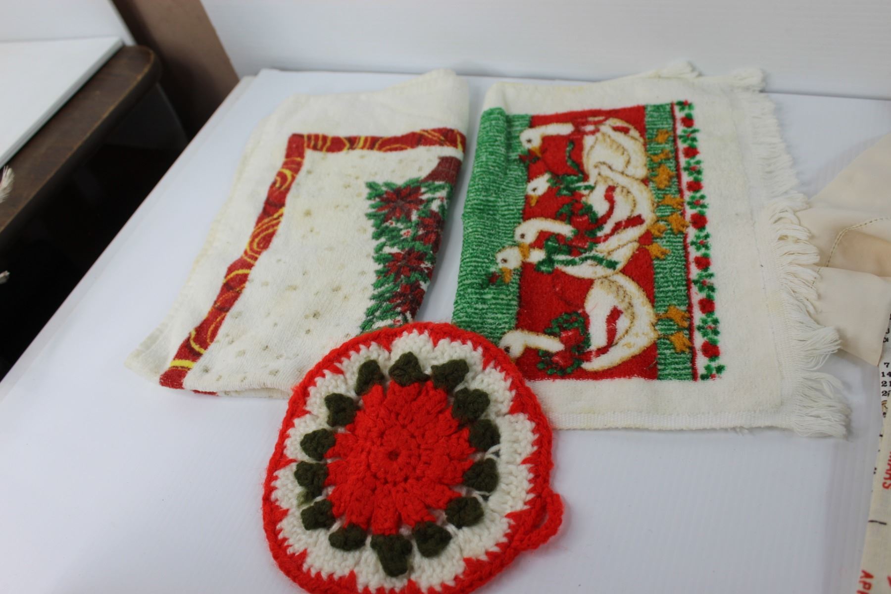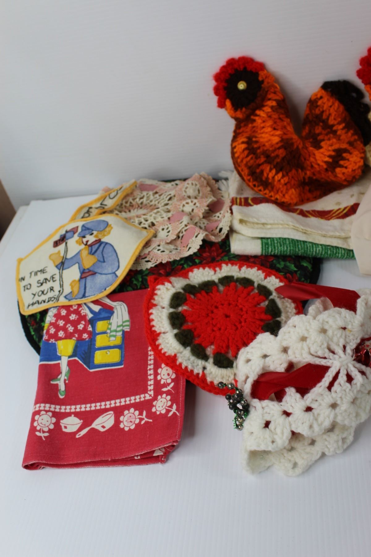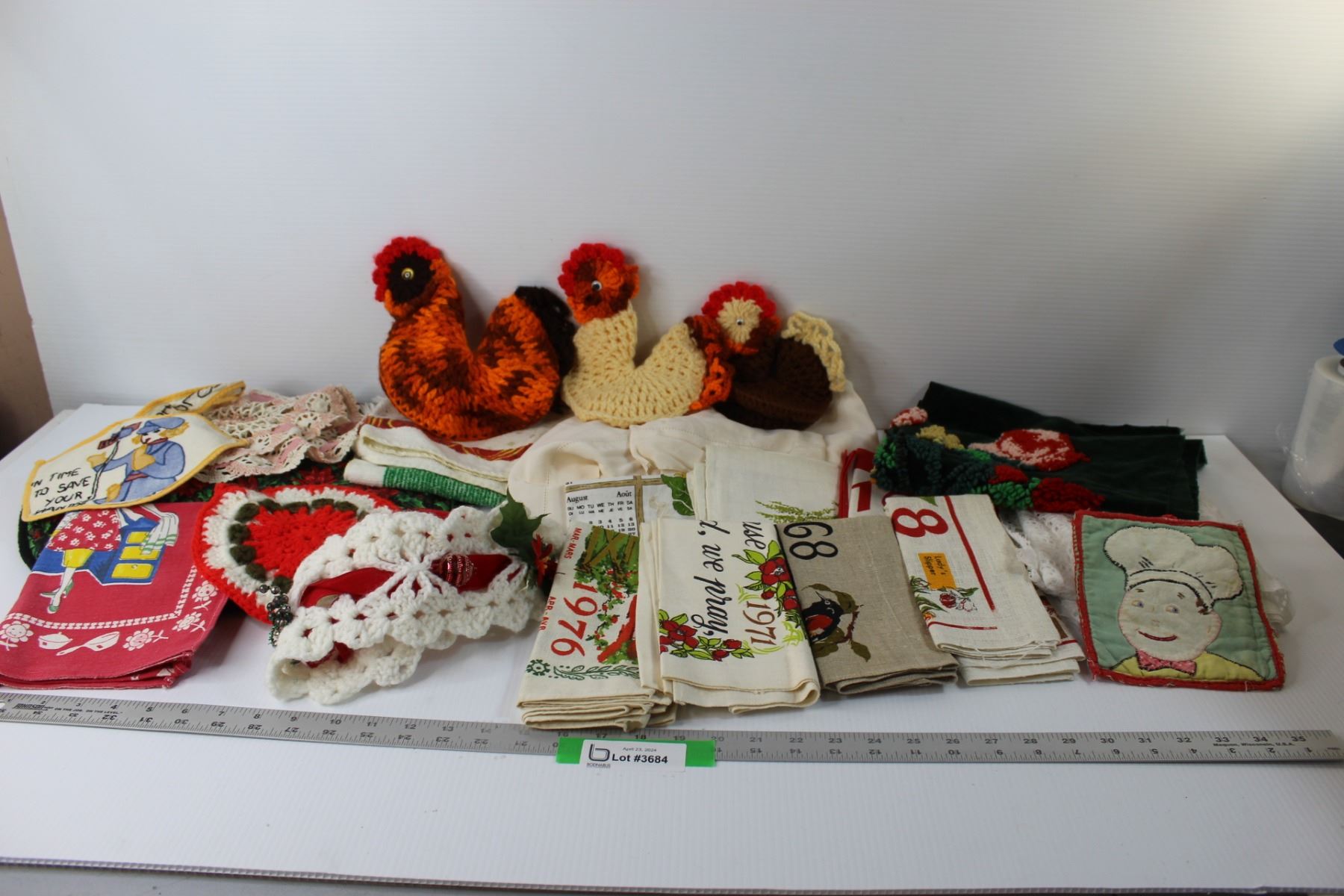 Lot of: (3) Rooster Pot Holders, Cloth Calendars, Christmas Table Decor, Misc.