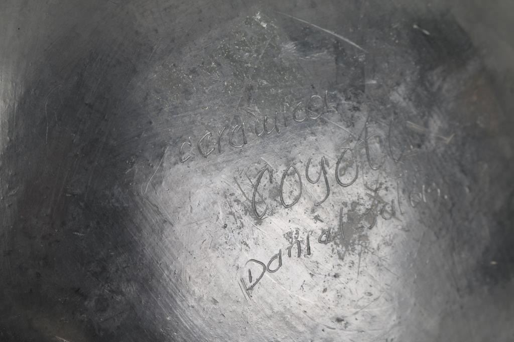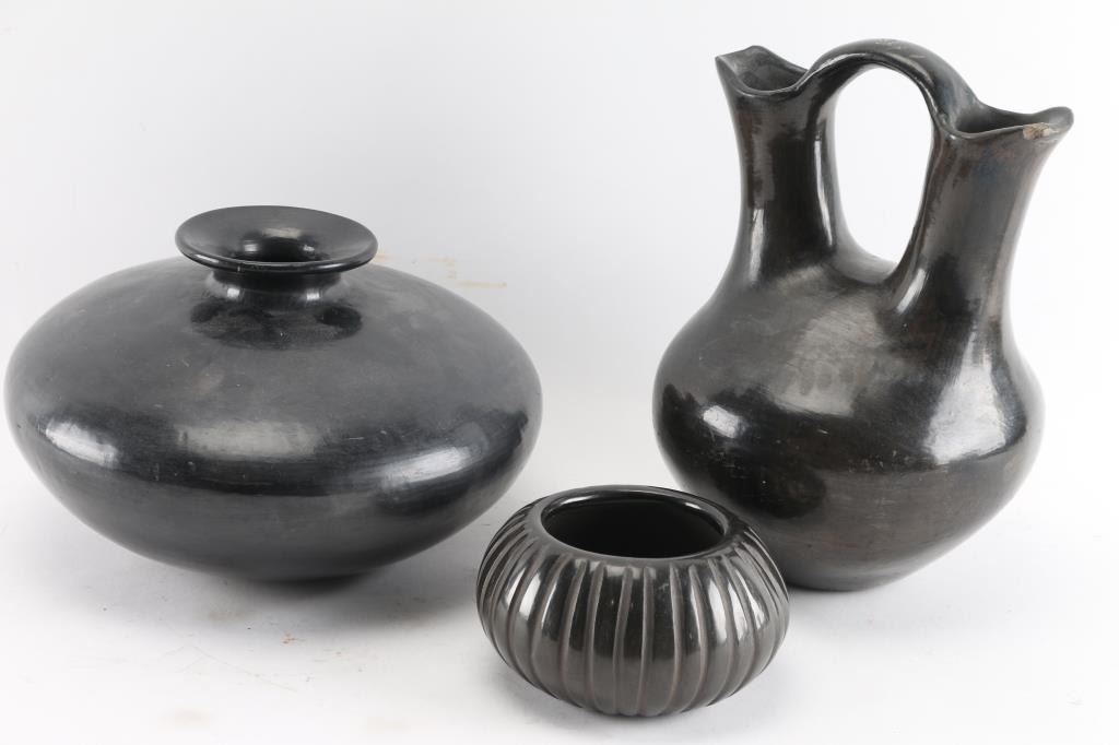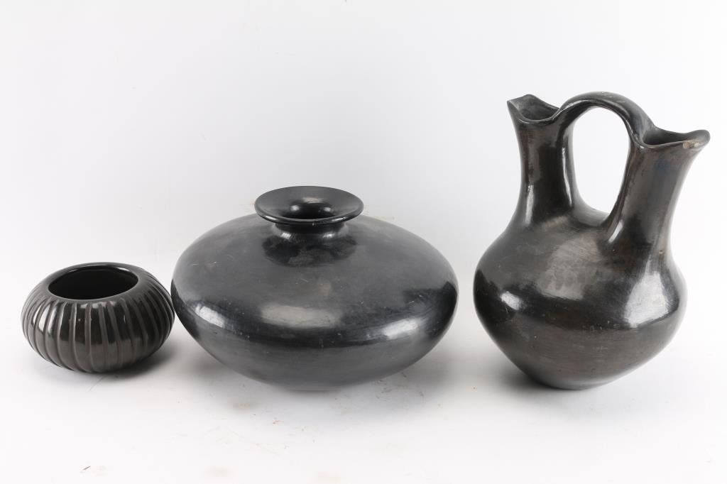 (2) Older black Santa Clara Pots, one is a double spout measuring 11" tall by 8" wide, has some chips on spout tips and handle, otherwise in good condition for age. Sticker on bottom "J087.37.2". The other is a large squat rounded pot narrowed at top, measuring approximately 7 1/2" x 11", shows a few nicks and scratches commensurate with age and use. Signed.