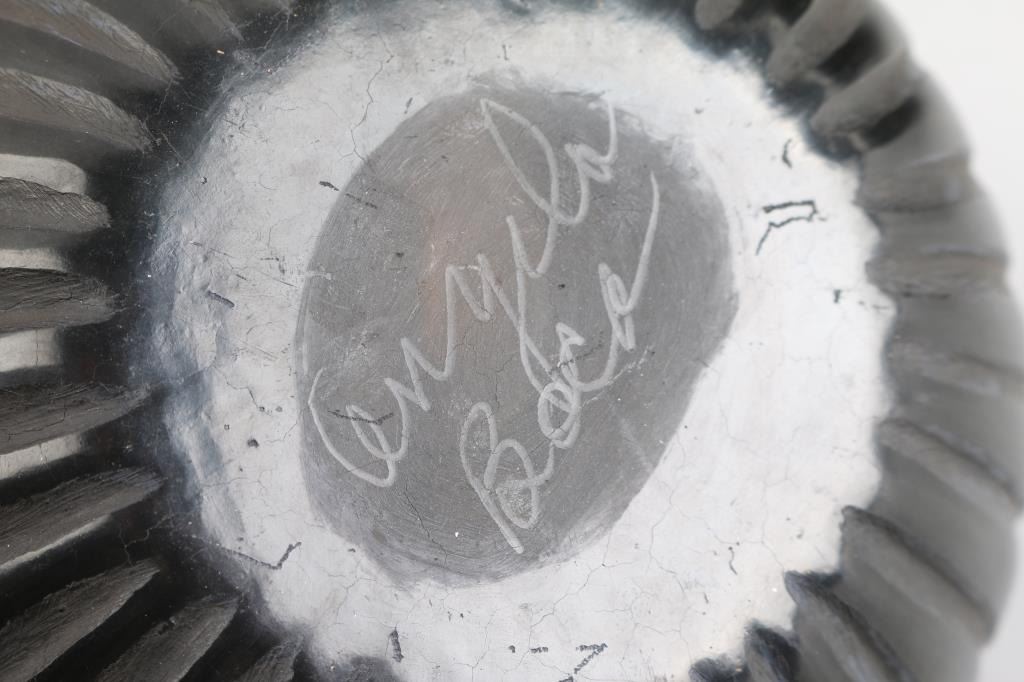 (1) Newer small black pot, signed on bottom, Angela Boca, with top to bottom groves all around. Very pretty, good condition. Measures 3 1/2 x 5 1/2, approximately.