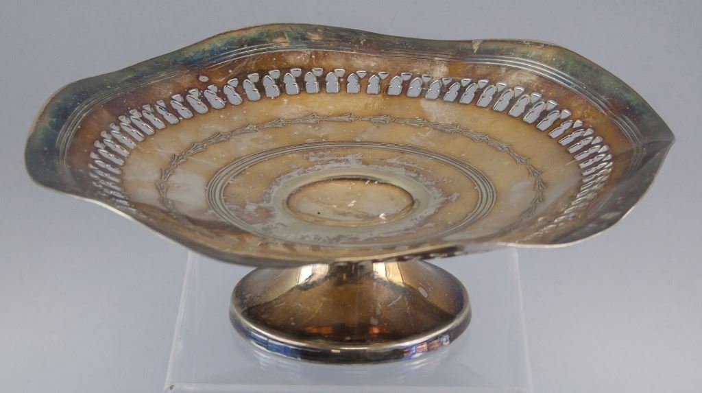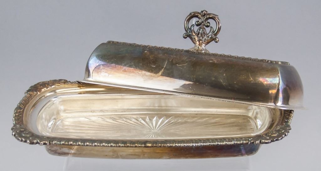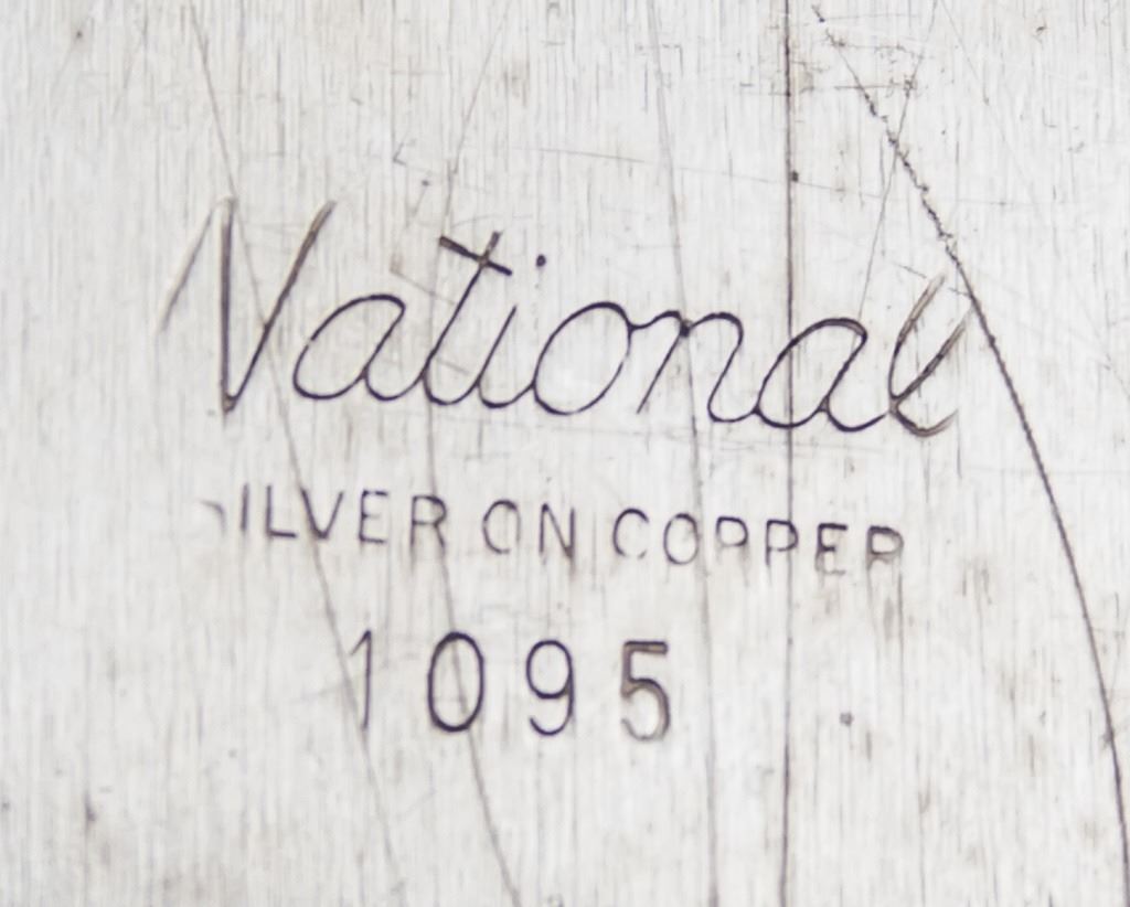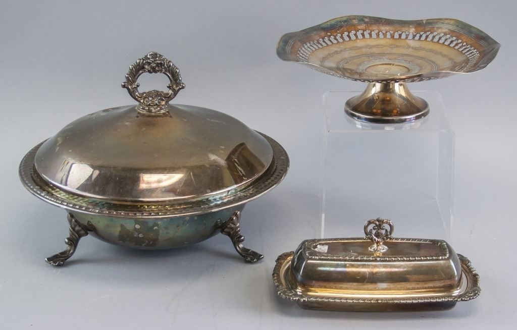 Lot of 3 serving dishes. One raised plate with wavy edges, one three-footed covered tureen, and one rectangular covered dish. "EPNS" stamped on raised plate. "National SILVER ON COPPER 1095" stamped on rectangular dish. "TRADE MARK PYREX MADE IN USA OVENWARE" stamped on tureen. "EP BRASS LEAD MTS USA" stamped on tureen. 20 x 27 cm. 3 kg.