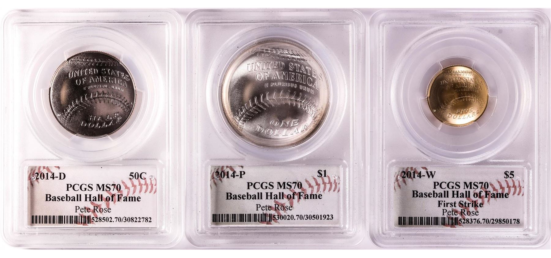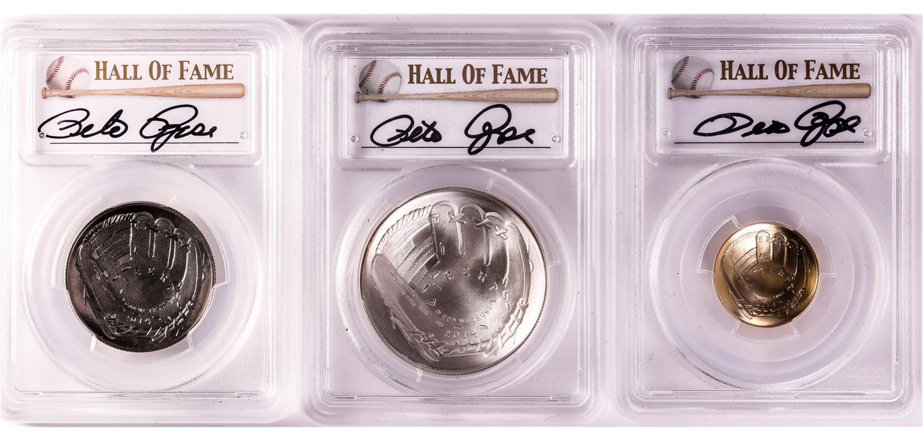 One Lot of (3) Set of 2014-W Baseball Hall of Fame Coins PCGS PR69DCAM Signed by Pete Rose. PCGS Graded.
