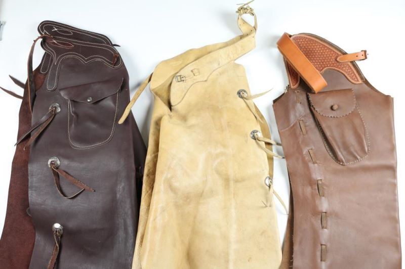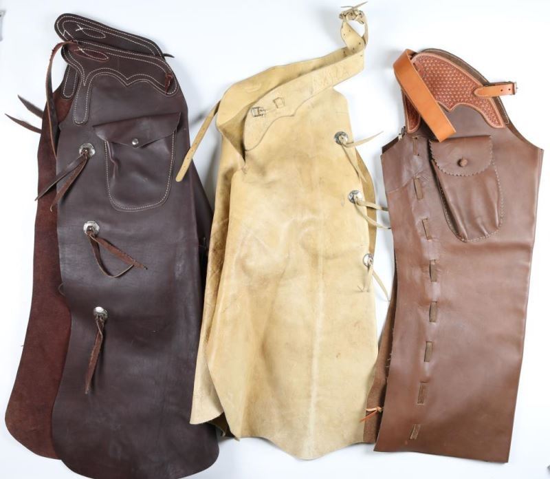 light yellowish color set in very good condition, appears to be elk or similar hide, signs of use and wear, with hook fasteners, approx 36" H x 10" wide at top on each wing, with approx 20" long strap. Medium brown color are very good with zippers, appear lightly used or unused, approx 38" H x 10" wide at top on each wing, with approx 22" long strap. Dark brown set are very good with hook clasps, appear unused or lightly used, , approx 41" H x 11" wide at top on each wing, with approx 20" long strap.