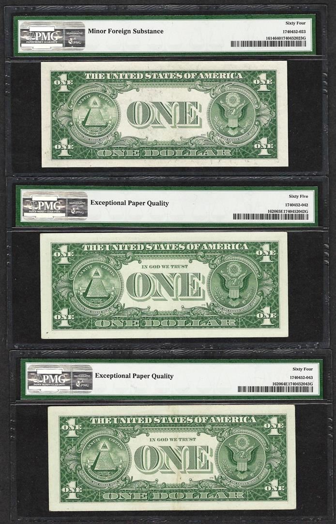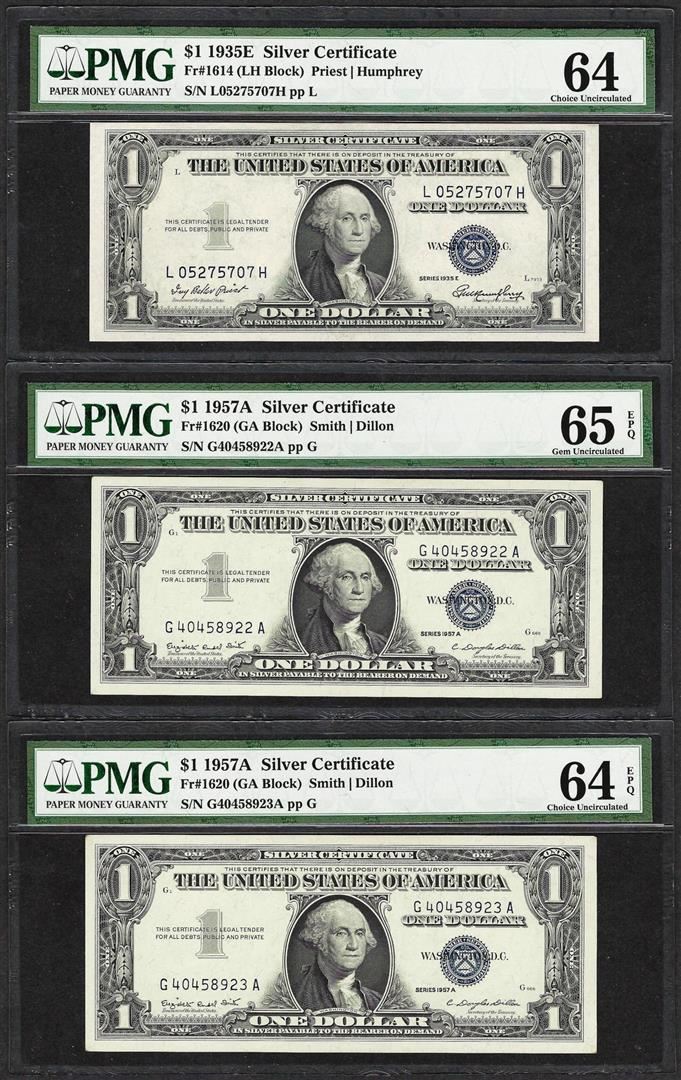 One Lot of (3) Silver Certificates 1935E Choice Unc 64, 1957A 64EPQ, 1957A Gem Unc 65EPQ. PMG Appraised.