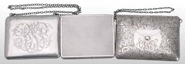 Description Lot includes one purse with a hinged flap engraved with scrolls, one similar change purse but plain with elaborate initials on the front, and one Continental case with beaded edges. The change purses are marked "STERLING". Condition (Very Good). Size Largest: 4" L.