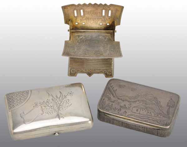 Description Weighs 8.6 troy ounces. Includes one rectangular box engraved with a village scene and mountains and the sides with hunters and running dogs. Also includes one cushion-shaped box with floral motifs engraved in top and one box in the form of a chair engraved with stylized floral motifs. Condition (Good). Size Largest: 3 - 1/4" L.