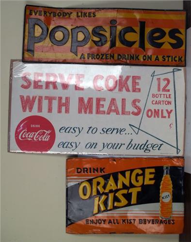 Lot of 3 Soda Signs Tin Orange Kist, Tin Popsicle, Paper Coca Cola 1954