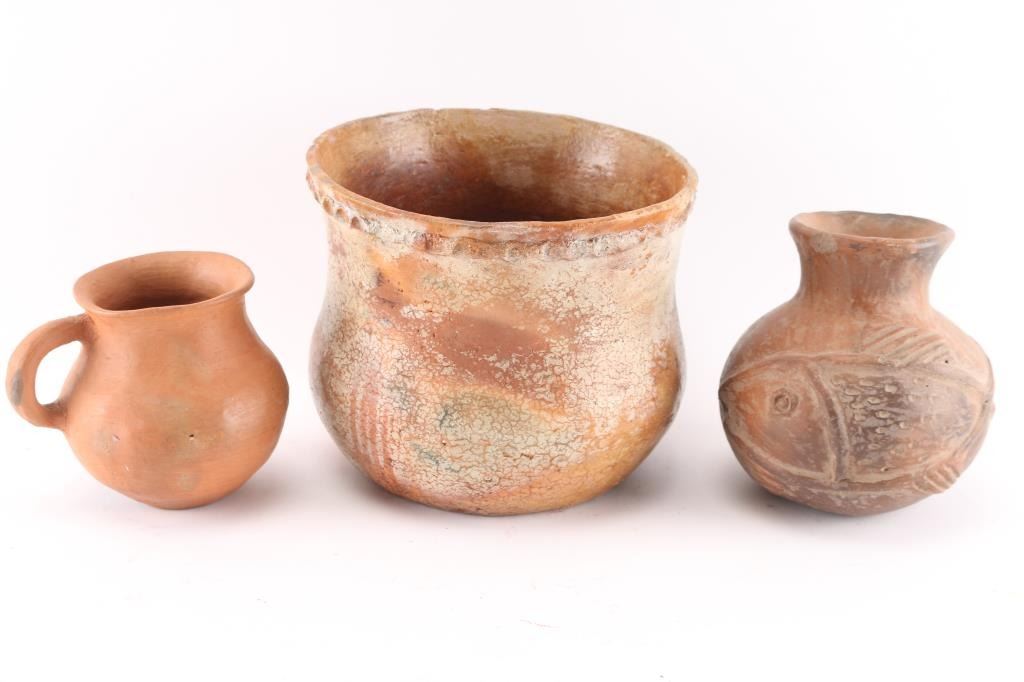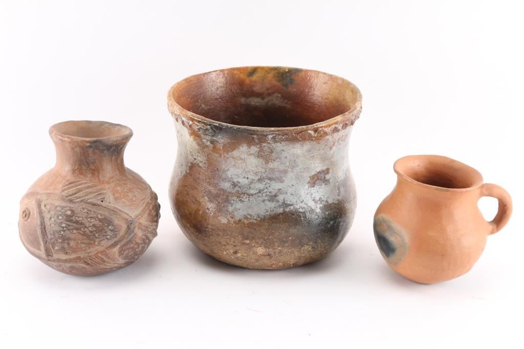 (1) A Navajo pot depicting fish, measuring 6" tall and 6" at widest. Small chip at rim. (1) A large glazed pot measuring 6 1/2" tall by 7 1/2" around, has a couple small chips at rim. (1) Smaller pitcher with handle measuring 4 1/2" tall by 4" around.