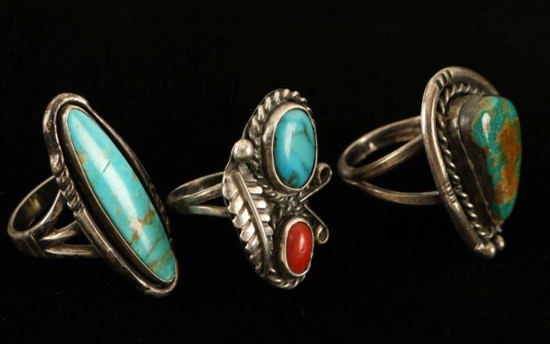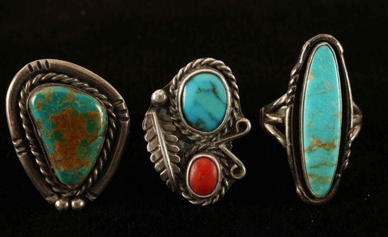 (1) turquoise and coral ring with rope and leaf design size 5 1/2, (1) large 1 1/4" oval turquoise ring size 7 1/4, and (1) green and brown triangular turquoise ring with rope and bead motif size 8 1/2. All are unmarked.