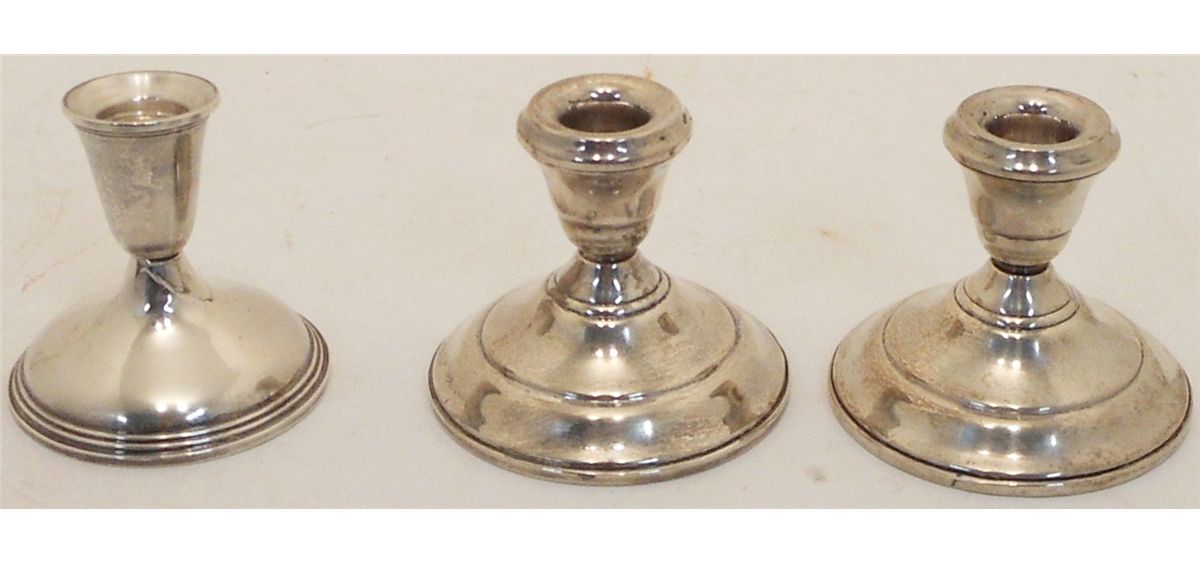 Pair of 3 1/4" Tall Sterling Silver Weighted Candlesticks. One 3 1/4" Empire Sterling Silver Weighted Candlesticks. All are Marked and are in Great Condition.