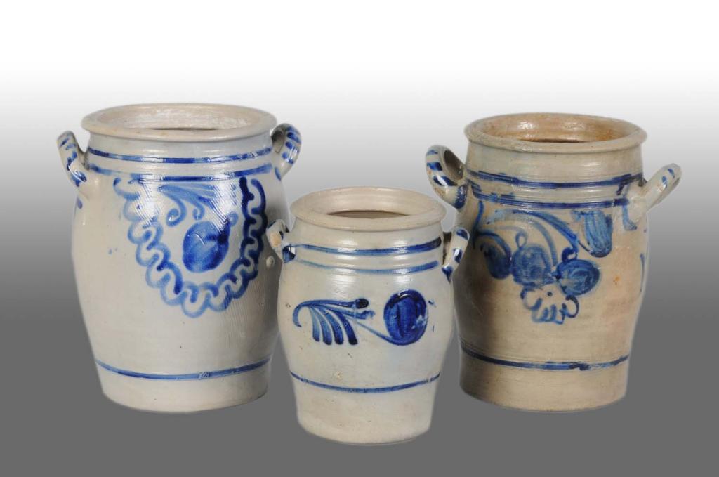 All three have two handles, two have floral decorations and one has blue decoration. No cracks, chips or repairs. Condition (Excellent). Size Largest: 11" T.