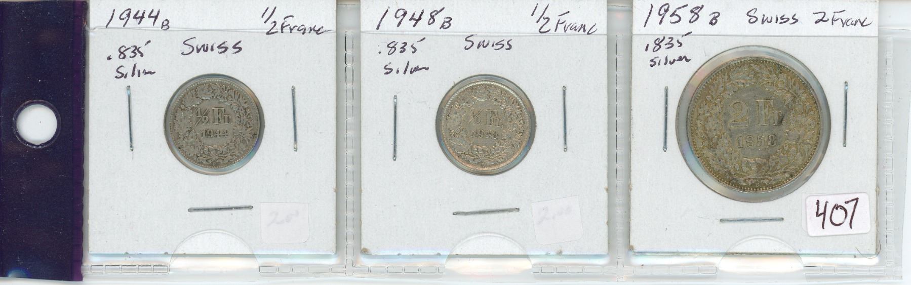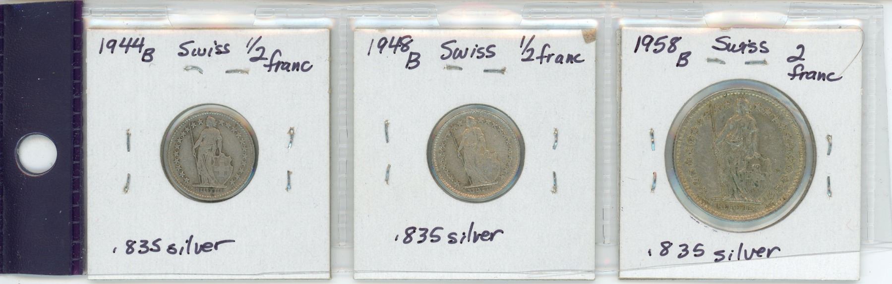 Lot of 3: Switzerland Silver 1944B, 1948B Half Franc & 1958B 2 Franc