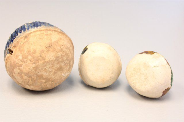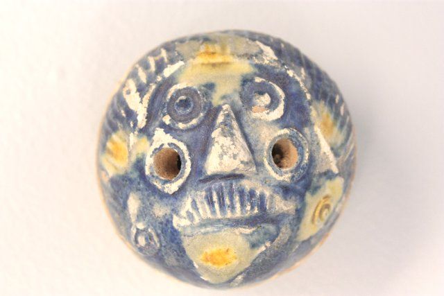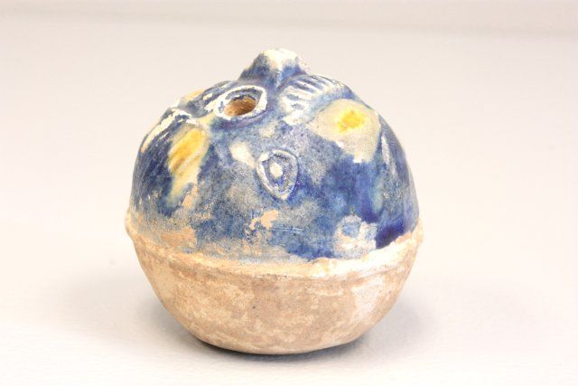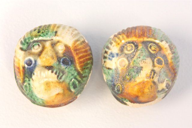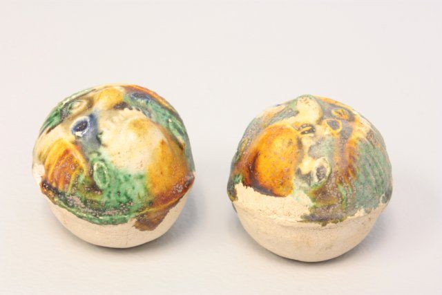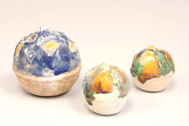 Earthenware with Sancai glazed decoration, "Mask" designs, 2 small, 1 large. Approx. 1.5" - 3" H. Please read our terms of sale.