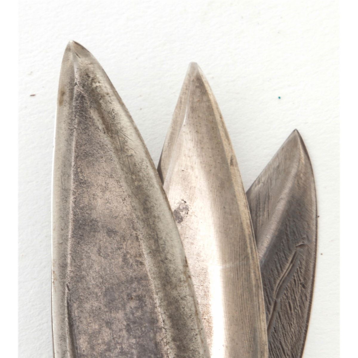 Lot of Three (3) Theatre Made/Modified Knives: 1.) 9'' clipped point blade, 16'' overall, brass ''S''-shaped guard, walnut handle held in place by two aluminum pins, with large brown leather sheath. 2.) 7-7/8'' blade modified from either a sword or bayonet, 12-3/8'' overall, steel full guard, stacked leather washer handle, steel pommel, leather boot lace style wrist thong, with brown leather five-pin sheath. Leather handle and front side of sheath have the letters ''HA'' scratched into the surface. 3.) 8-3/4'' clipped point blade, 14-1/2'' overall, aluminum guard and handle, tooled leather sheath with the name ''WALT'' scratched on front. Conditions are very good overall as modified. The aluminum handle with a crack to one side. All knives show normal signs of age and use. Est.: $250-$350/lot.