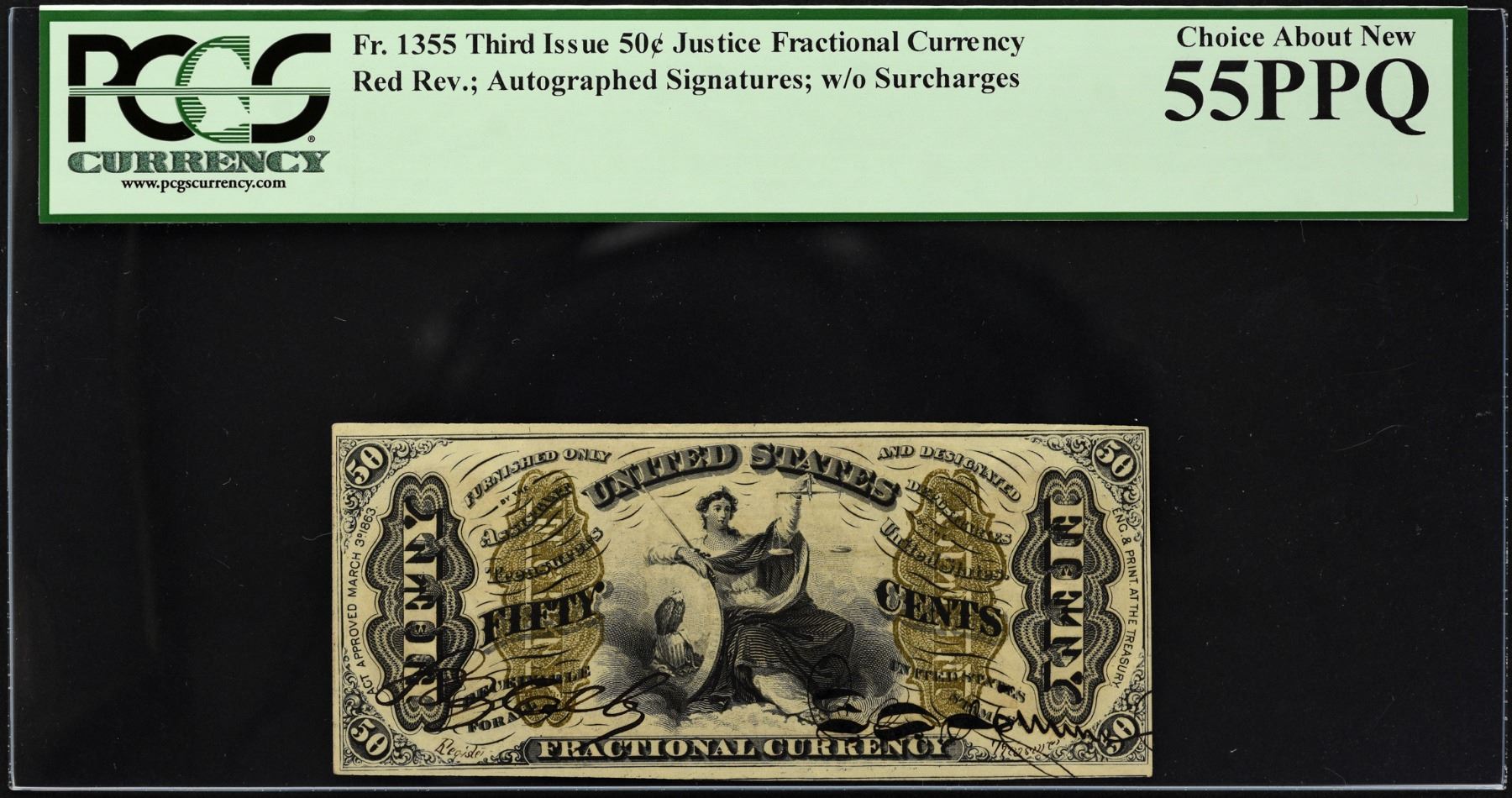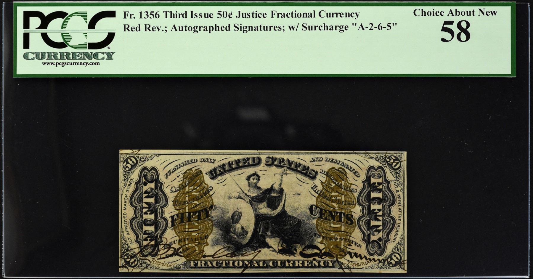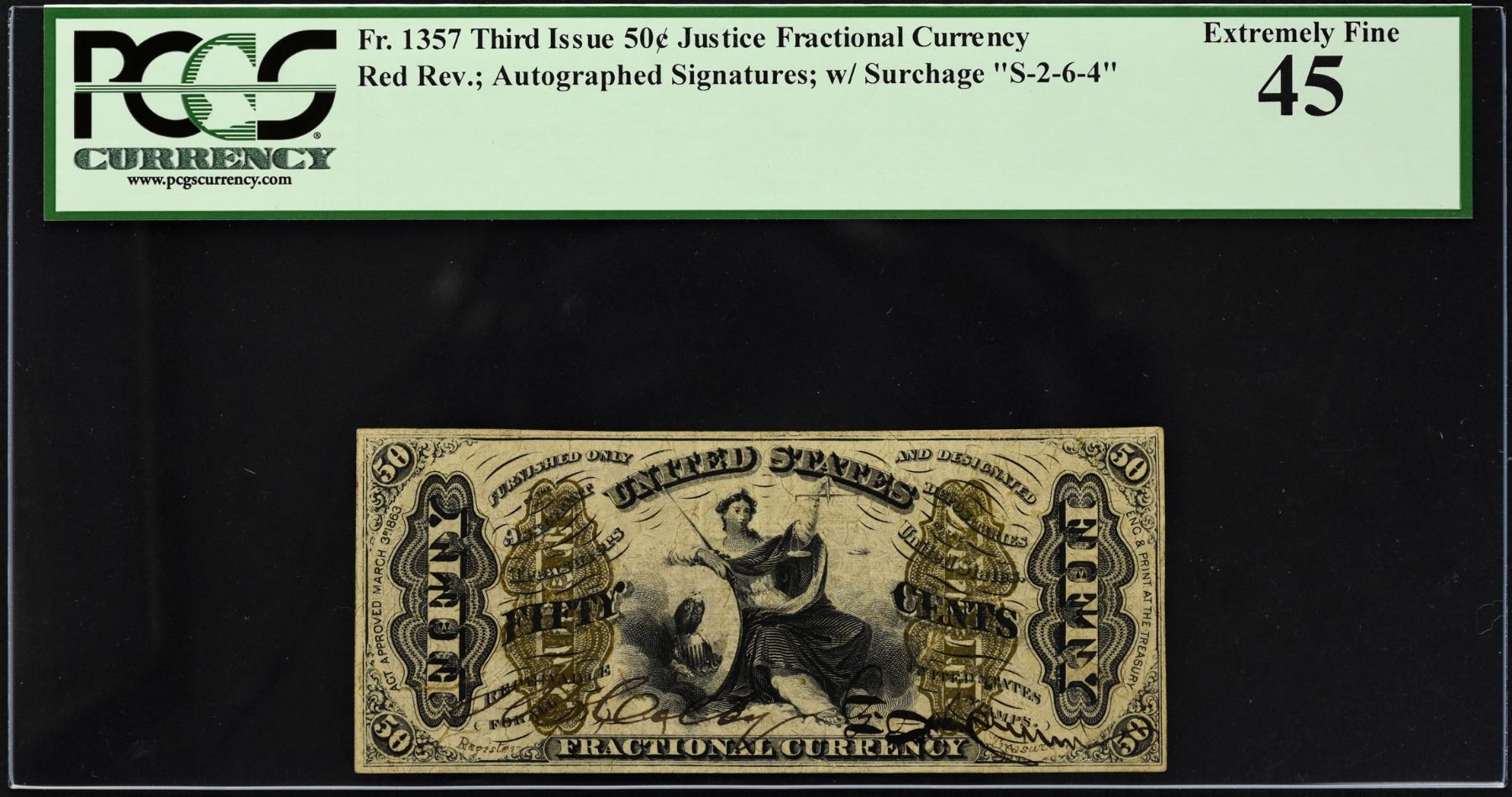 An important trio of these autographed Justice notes which includes the scarce Fr. 1357 fiber paper note. Included is the following; Fr. 1355 in Choice About New 55 PPQ; Fr. 1356 in Choice About New 58; Fr. 1357 "S-2-6-4" surcharged on fiber paper in Extremely Fine 45.