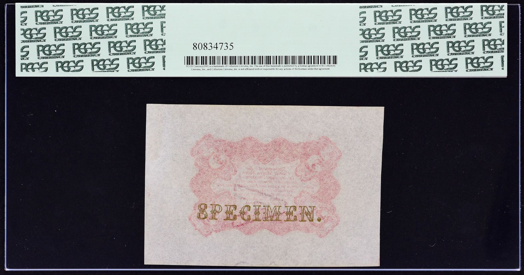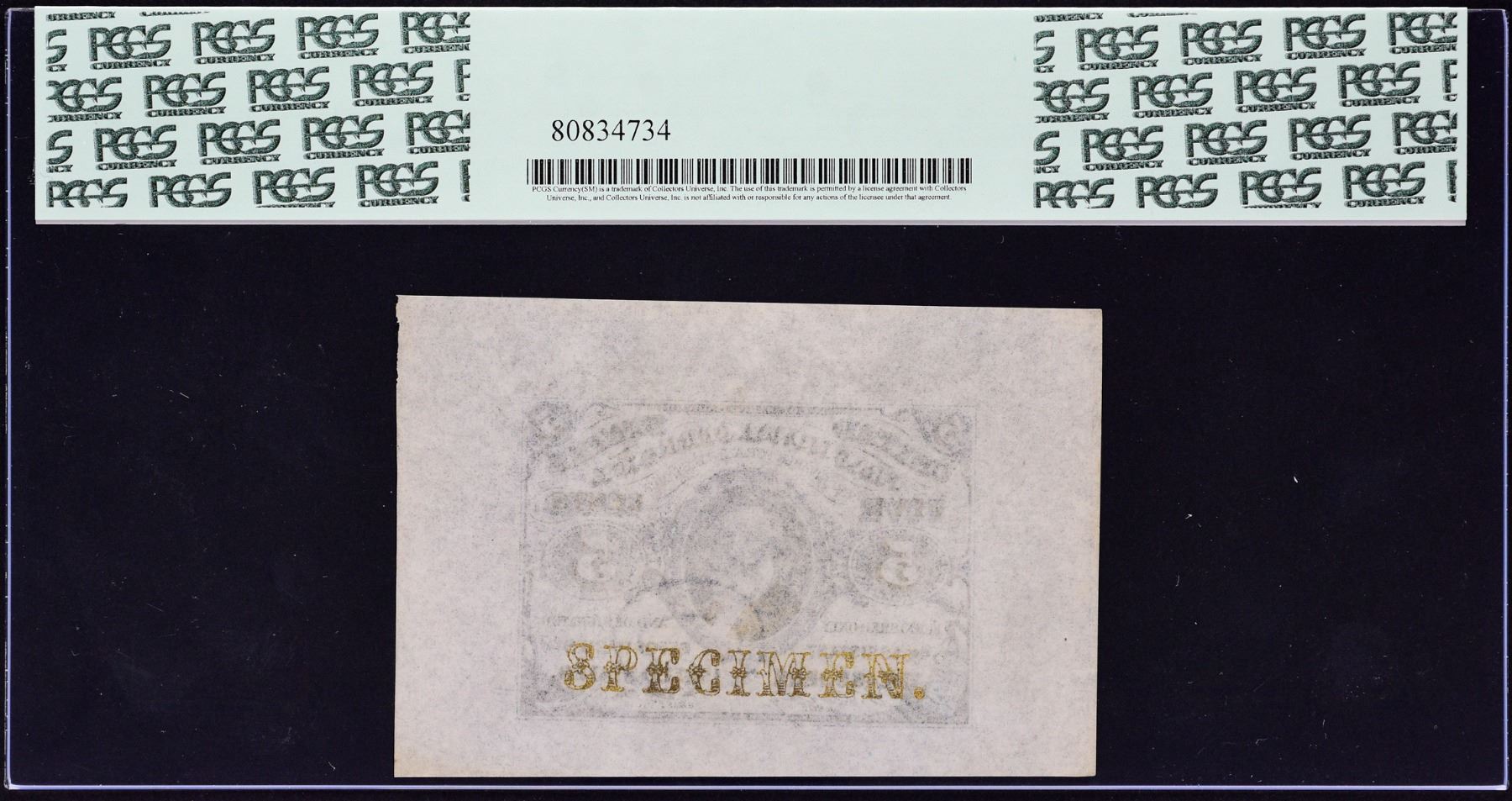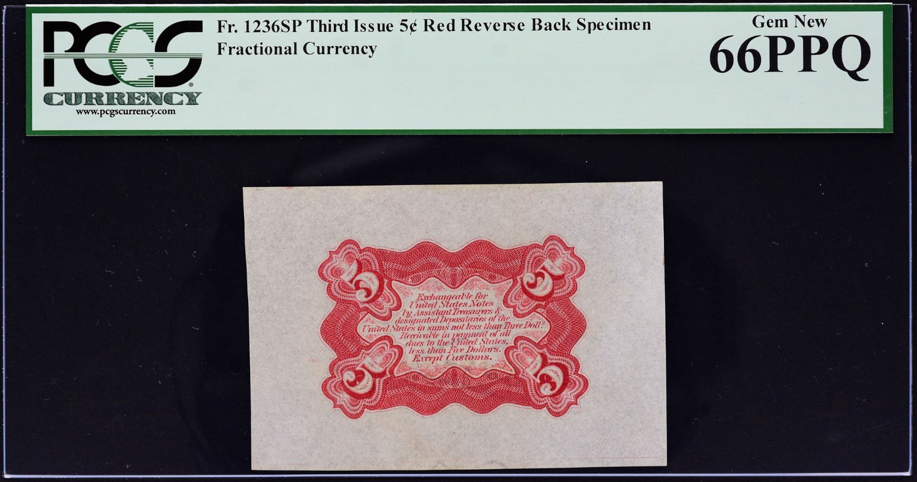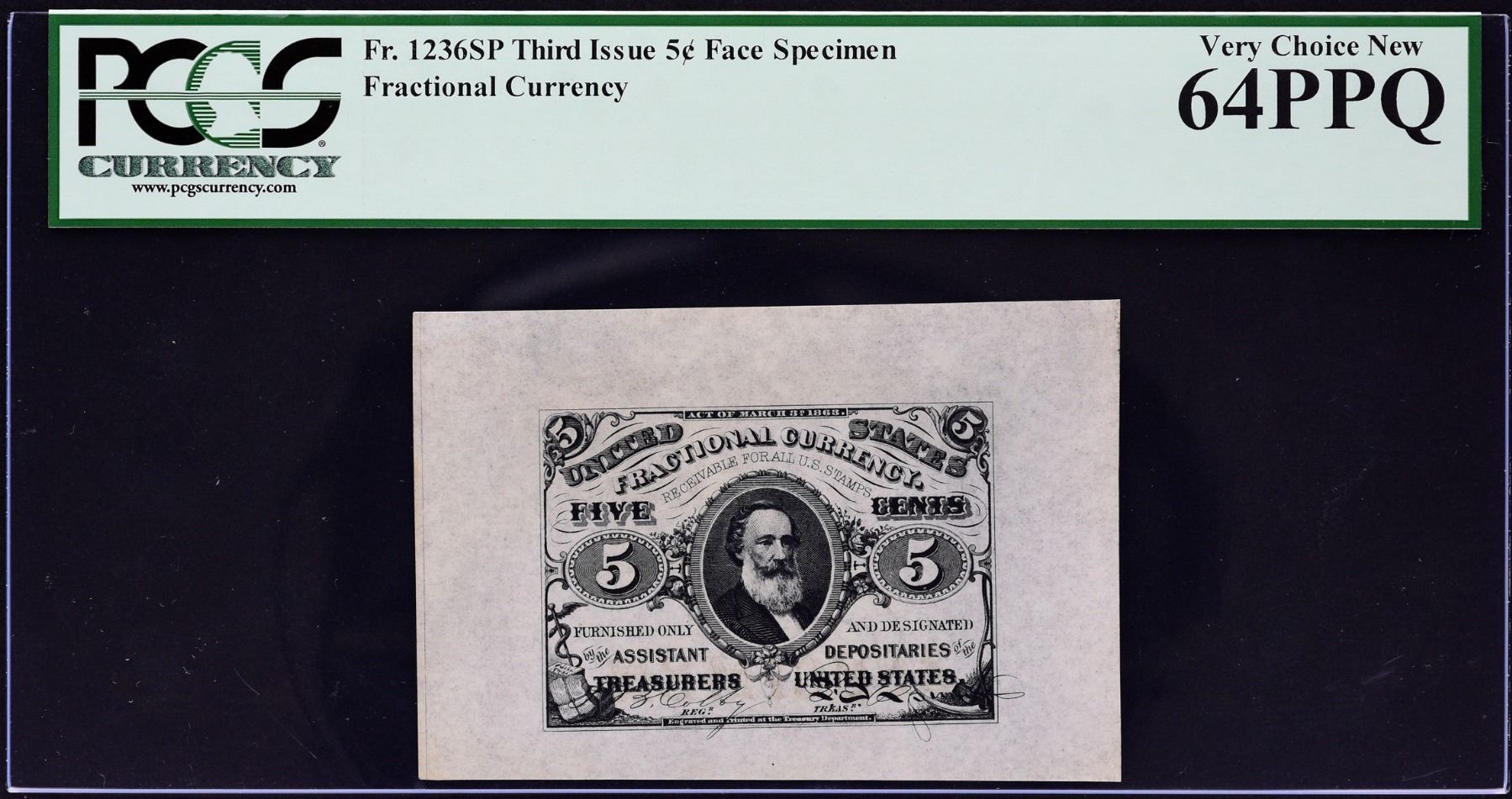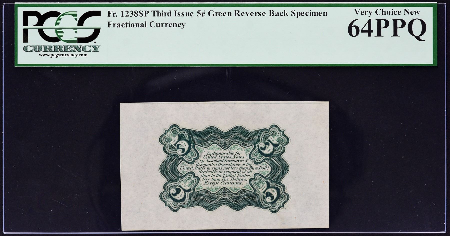 A gem trio of 5c notes. Fr. 1236sp face in Very Choice New 64 PPQ; Fr. 1236 back in Gem New 66 PPQ; Fr. 1238sp back in Very Choice New 64 PPQ.