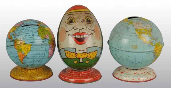 Description Includes one Humpty Dumpty bank and two Globe banks. Condition (Very Good).