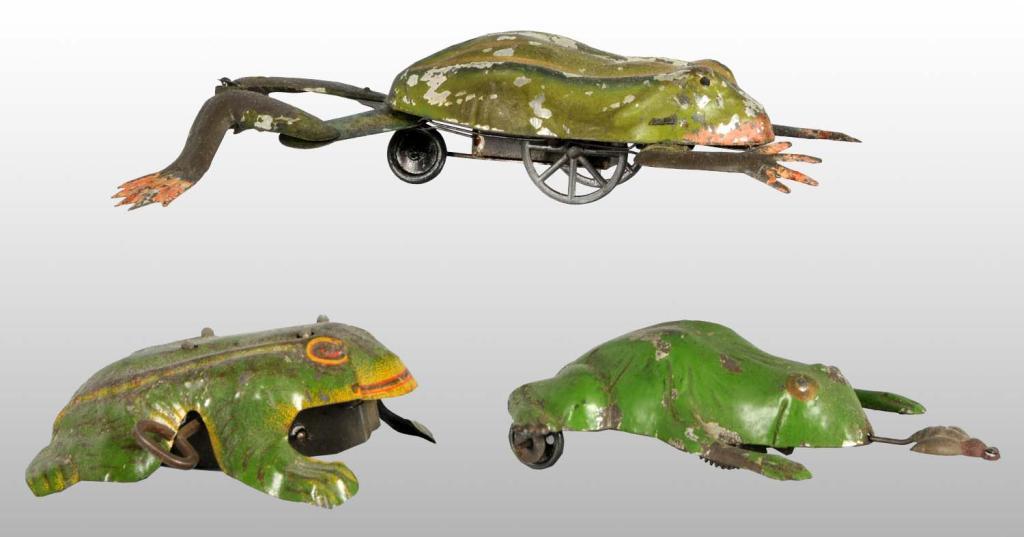Description German. Working. Includes one tin lithographed and two hand-painted tin. Smallest toy makes a jumping motion when wound, medium-sized has a bee in front that simulates going in and out of frog's mouth when wound, and largest toy is earlier than the others with a more intricate mechanism where the legs and feet all move as it rolls. One small piece of the attached key is missing on the medium-sized frog with moderate overall paint loss and wear to all three. Condition (Very Good). Size Largest: 7" L.