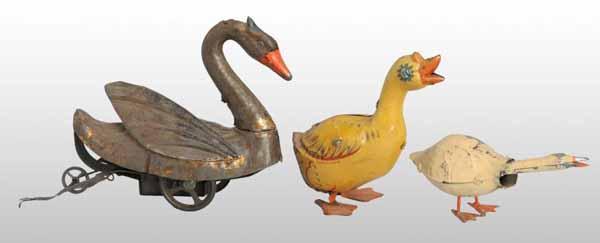 Description German and Japanese. The smallest toy is a nodder with no wind-up mechanism while the other two are wind-up and working. The largest toy is missing a wing with moderate wear overall. Condition (Very Good). Size Largest: 5" L.