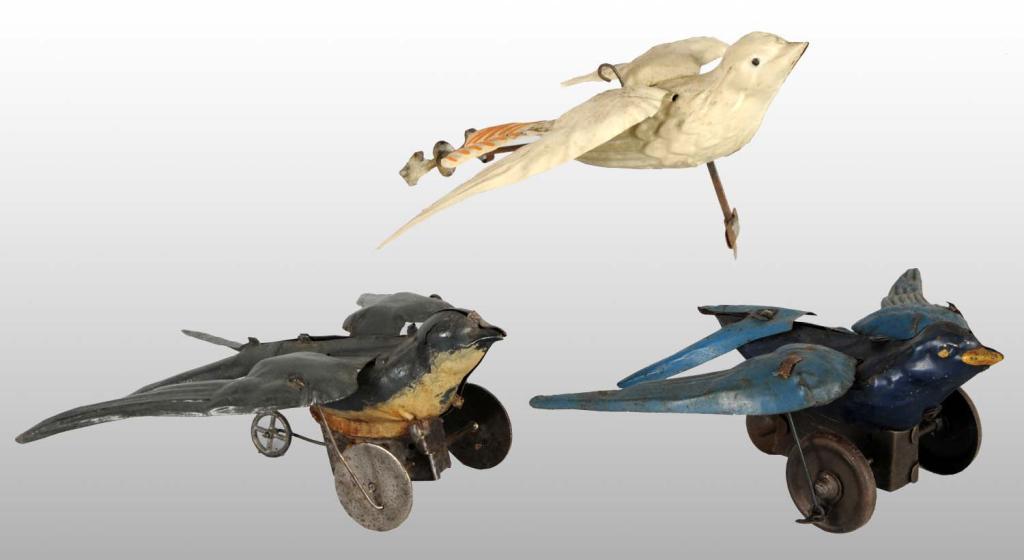Description German. Working. Includes three different colored versions of similar toy. One is a little different from other two with a spinner in back with circular cardboard pieces in back that spin around. The other two toys are three-wheel mechanism bases. Very little wear. Condition (Very Good - Excellent). Size All: 6" L.