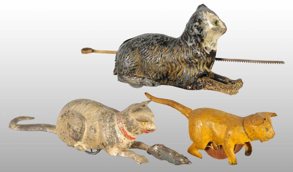 Description German and American. Includes one American cat toy pulled by string, one German cat toy pulled by early, metal rod with flywheel mechanism, and one tin cat chasing mouse toy. Moderate overall paint loss and wear. Condition (Very Good). Size Largest: 9" L.