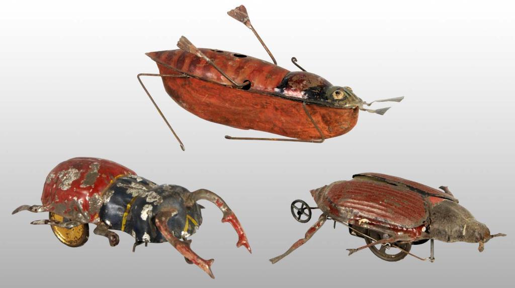 Description German. Working. Includes one beetle, one fly, and one water-bug-type toy. Moderate overall paint loss and wear. Condition (Very Good). Size All: 6" L.