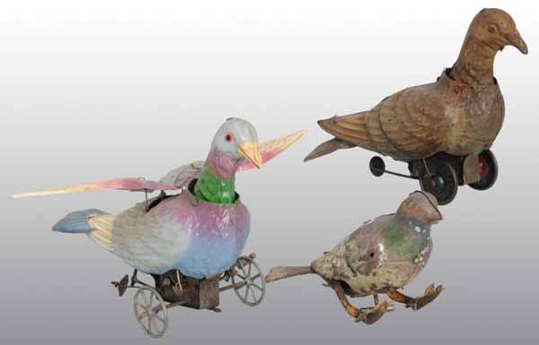 Description German. Working. Largest pigeon toy has been restored and has flapping wings and non-working bellows. Medium sized pigeon toy has working bellows that emits a chirp and the smallest pigeon toy pecks up and down when wound. Moderate overall wear. Condition (Good - Very Good). Size Largest: 8" L.