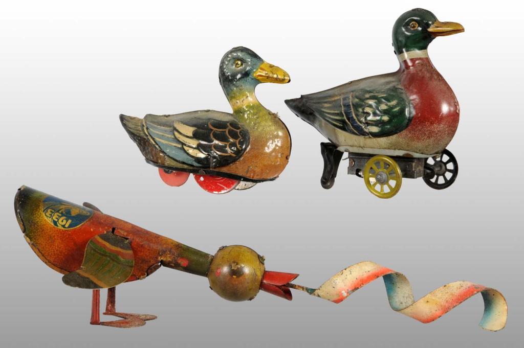 Description German. Working. Includes a wind-up duck with metal ribbon in mouth depicting worm and 1933 "A Century of Progress" Chicago World's Fair sticker on back. Second is a wind-up duck and last is a Hess friction roller Tippu-Tipp Duck. All are marked "DRGM Made in Germany" with minor overall wear. Condition (Very Good - Excellent). Size Largest: 5" L.