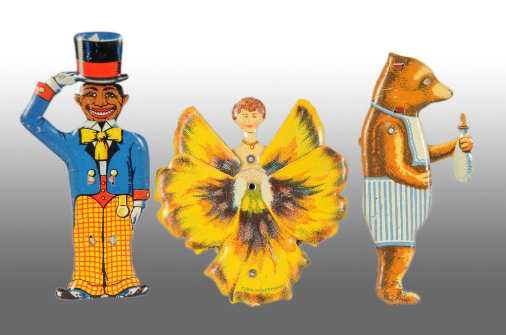 All 1930s. Includes one clown that changes face to a black man marked "CKO" on front, one is a baby bear that lifts milk bottle via pull string marked "Made in Germany" and one flower that opens to reveal a woman operated by a pull string marked "Made in Germany". Beautiful litho on all toys with nice animated movements and minor wear. Collection of Carl Lobel. Condition (Excellent - Near Mint). Size All: 3 - 1/2" T.