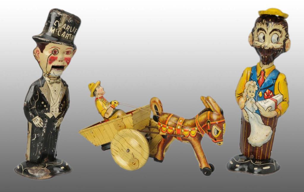 Description American. Working. Includes B.O. Plenty Walker with original hat, Charlie McCarthy Walker with movable mouth, and Balky Mule toy. Charlie McCarthy has moderate scratching. Condition (Good - Very Good). Size All: 8".