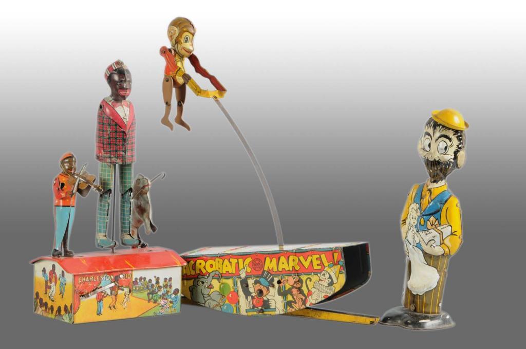 American. Includes one B.O. Plenty, one Acrobat Monkey Marvel and one Charleston Trio missing arms on center figure. B.O. Plenty's mechanism does not work. Moderate overall wear. Condition (Good - Very Good). Size Largest: 10" T.