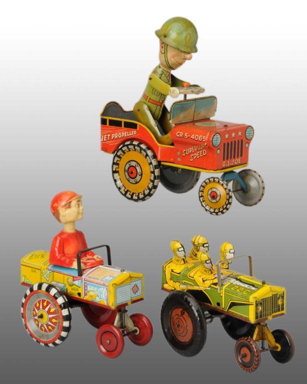Description American. Includes two Marx, one Jumping Military Jeep, one Dan in car with plastic figure, and one Unique Art GI Joe in Jeep toy. Some fading to Dan car with moderate scratching throughout all three. Condition (Very Good). Size Largest: 7 - 1/2".