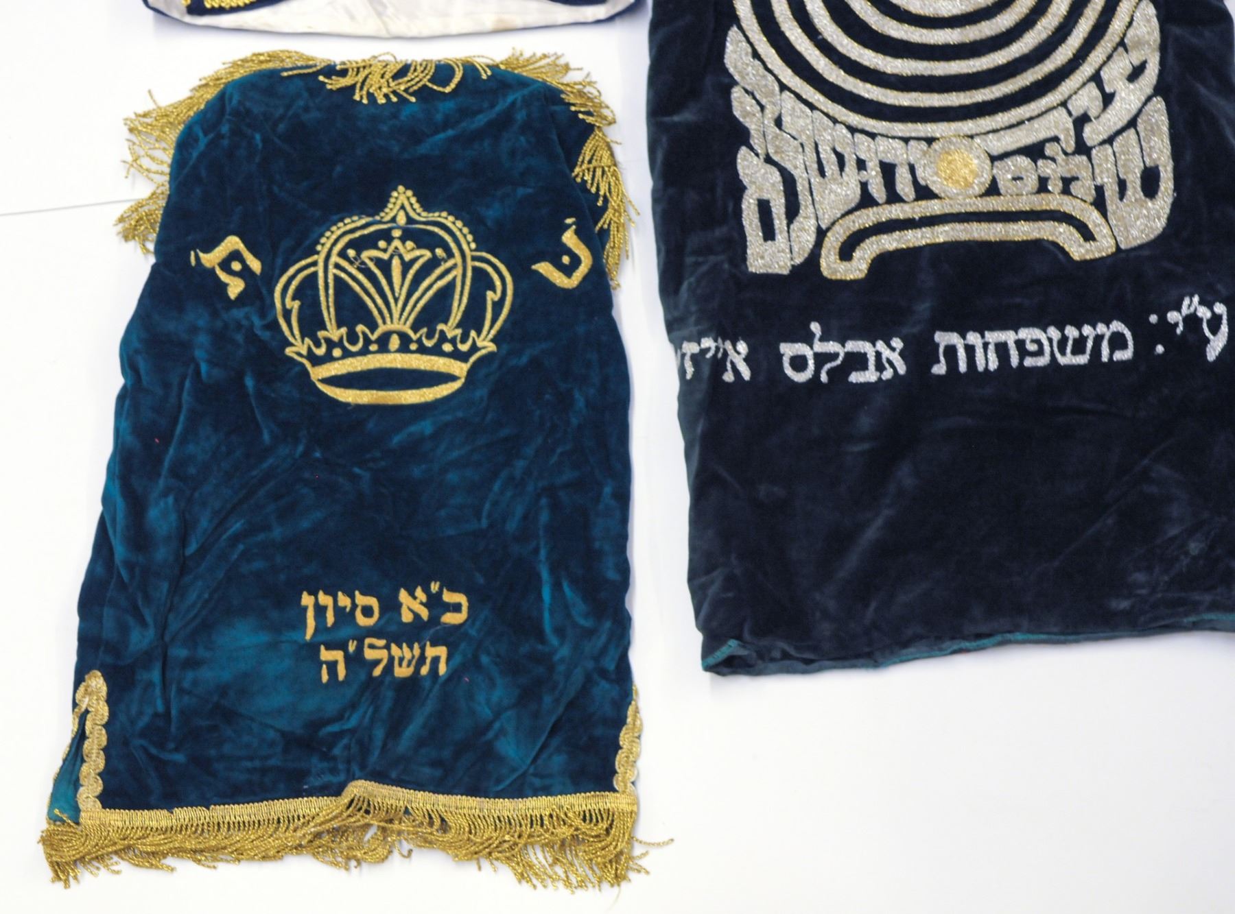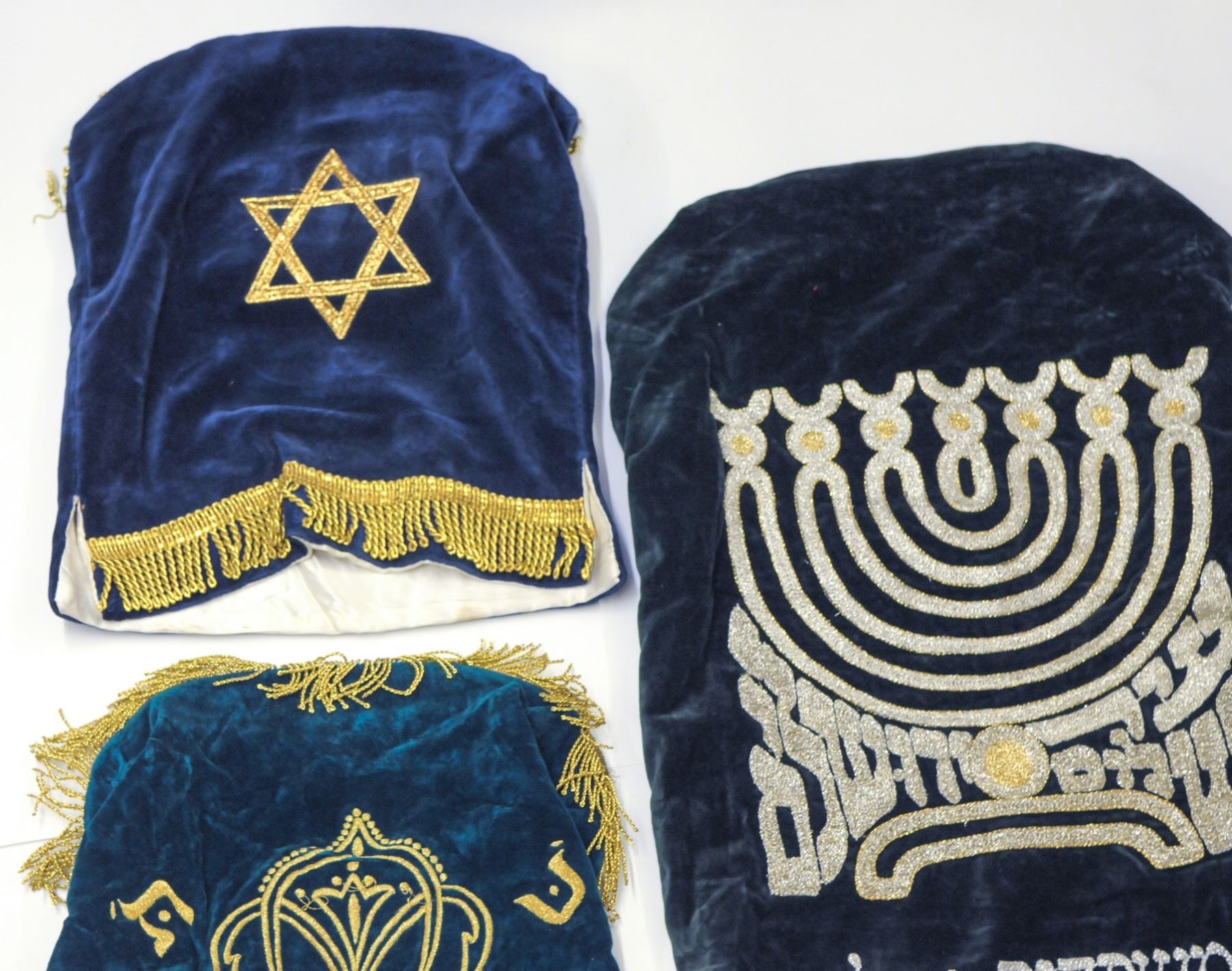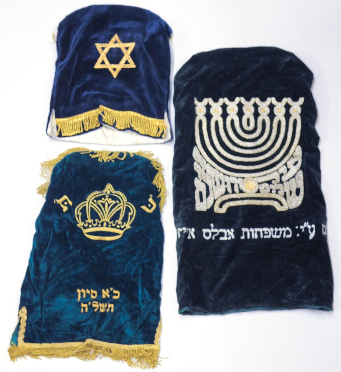 Lot of 3 Torah book mantles: 1. A small Torah mantle, second half of the 20th century, green velvet, decorated with an embroidery of a Torah crown, dated: 21 Sivan 1975, length: 48 cm , 2. Small Torah mantle, second half of the 20th century, cobalt blue velvet, embroidered with Star of David, length: 36 cm 3. Torah mantle, second half of the 20th century, dark green velvet, decorated with an embroidered menorah and the Hebrew inscription "City of Peace Jerusalem" and an inscription of the family donated it, length: 70 cm.