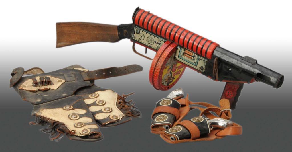 Description Includes one Marx G-man wind-up gun not working, one cowboy holster set without guns, and one small holster set with two white Texas guns. Condition (Good - Very Good). Size Largest: 23" L.