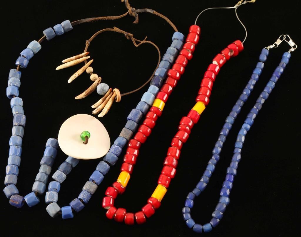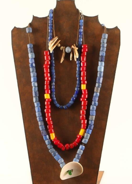 Red heart and yellow beaded necklace from the Dakotas, Russian blue beaded necklace, and Russian blue trade beads on leather cord with bone and green bead accent, also includes a Yakima leather cord bracelet with elk antler and coyote teeth.