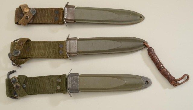 Lot of 3 U.S. bayonet sheaths only (no bayonets) including a US M8 by BM Co., a US M8A1 by B.M. Co. and a U.S.M8A1 by PWH; all in overall very good condition, one with leather tie down. Est.: $25-$50.