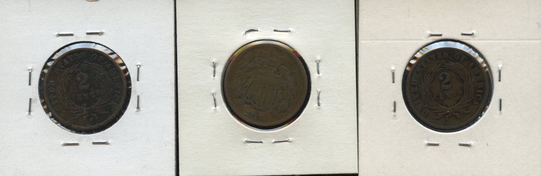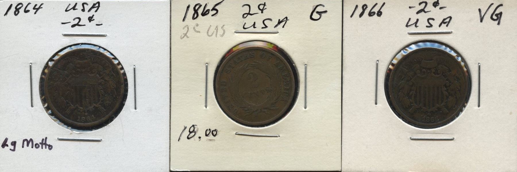 Lot of 3 US 2c coins, 1864-1866 (G to VG)