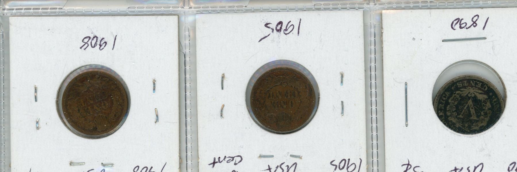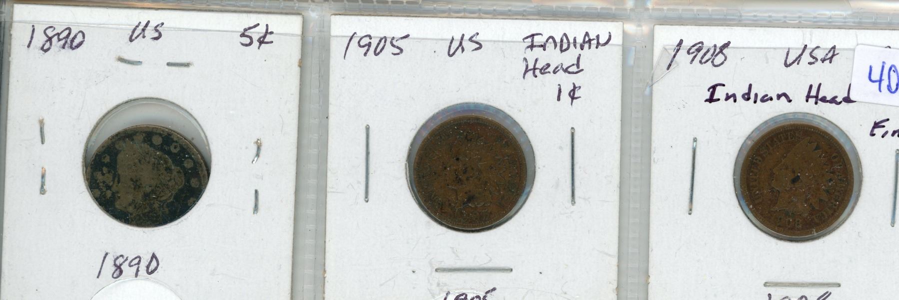 Lot of 3: USA 1890 Liberty 5¢, 1905 & 1908 Indian Head One Cent