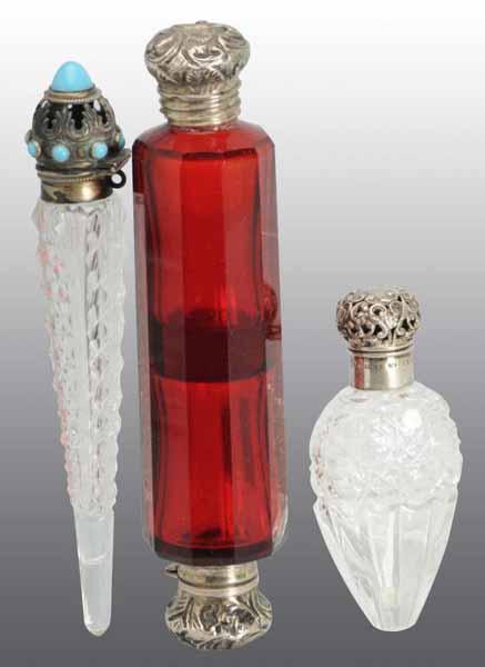 Description All have sterling tops but do not have their stoppers. Lot includes one double perfumer in ruby glass and one bottle with a top that does not have its hinge but has no damage to the glass. Also includes a cut crystal bottle with turquoise stones in top and a cut glass bottle with sterling hinge top. Condition (Excellent). Size Largest: 4 - 1/2" L.