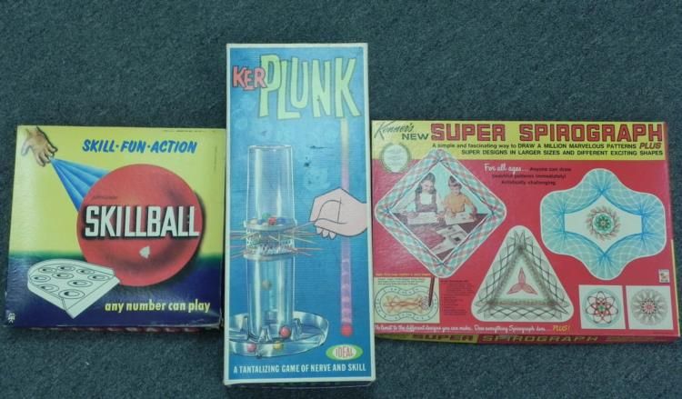 Games include: Kerplunk (Ideal Toy Corp., 1967) Skillball (Pressman Toy Corp., 1940's-50's) Super Spirograph (Kenner Products Co., 1969)