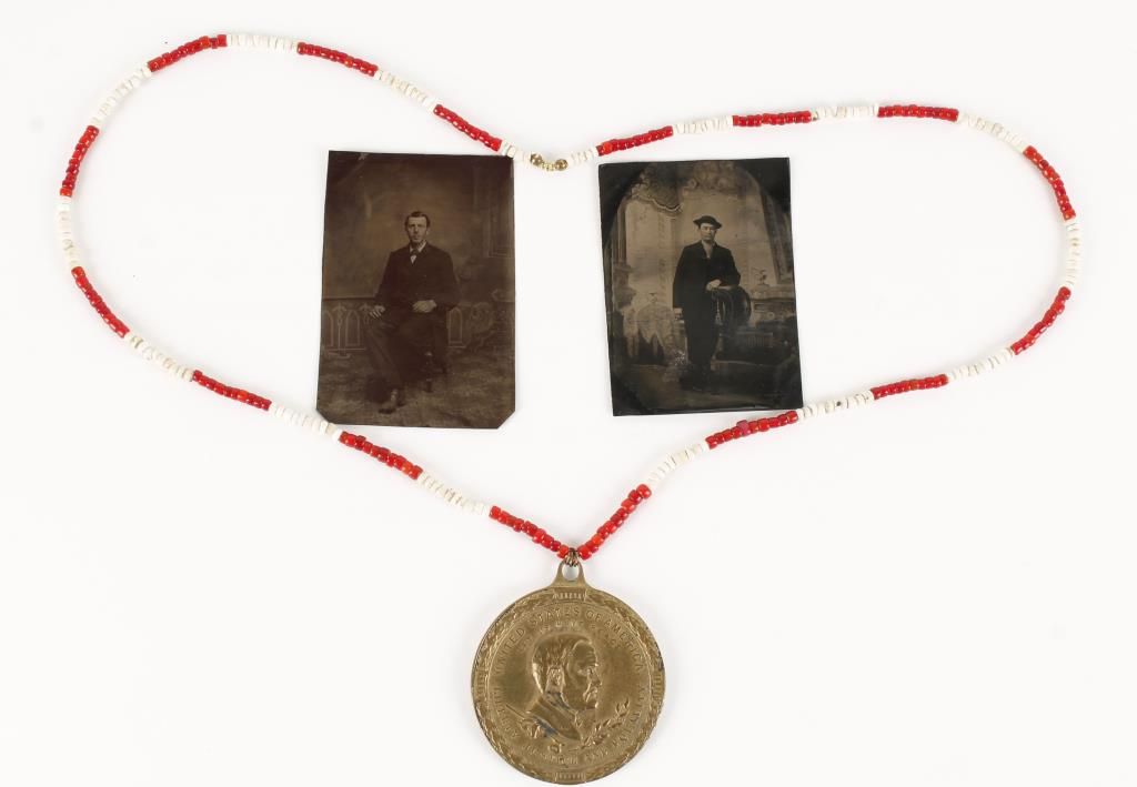 Includes a copy of an 1871 United States Indian Peace medal, and 2 vintage 'tin type' photographs of late 19th century Gentlemen.