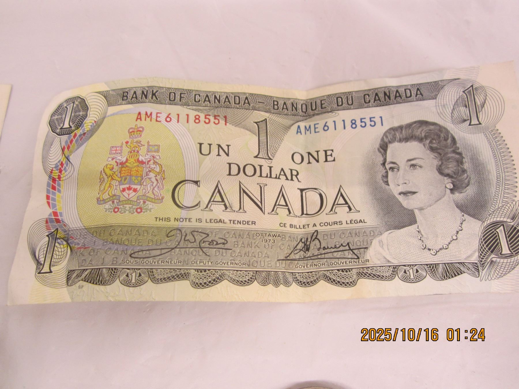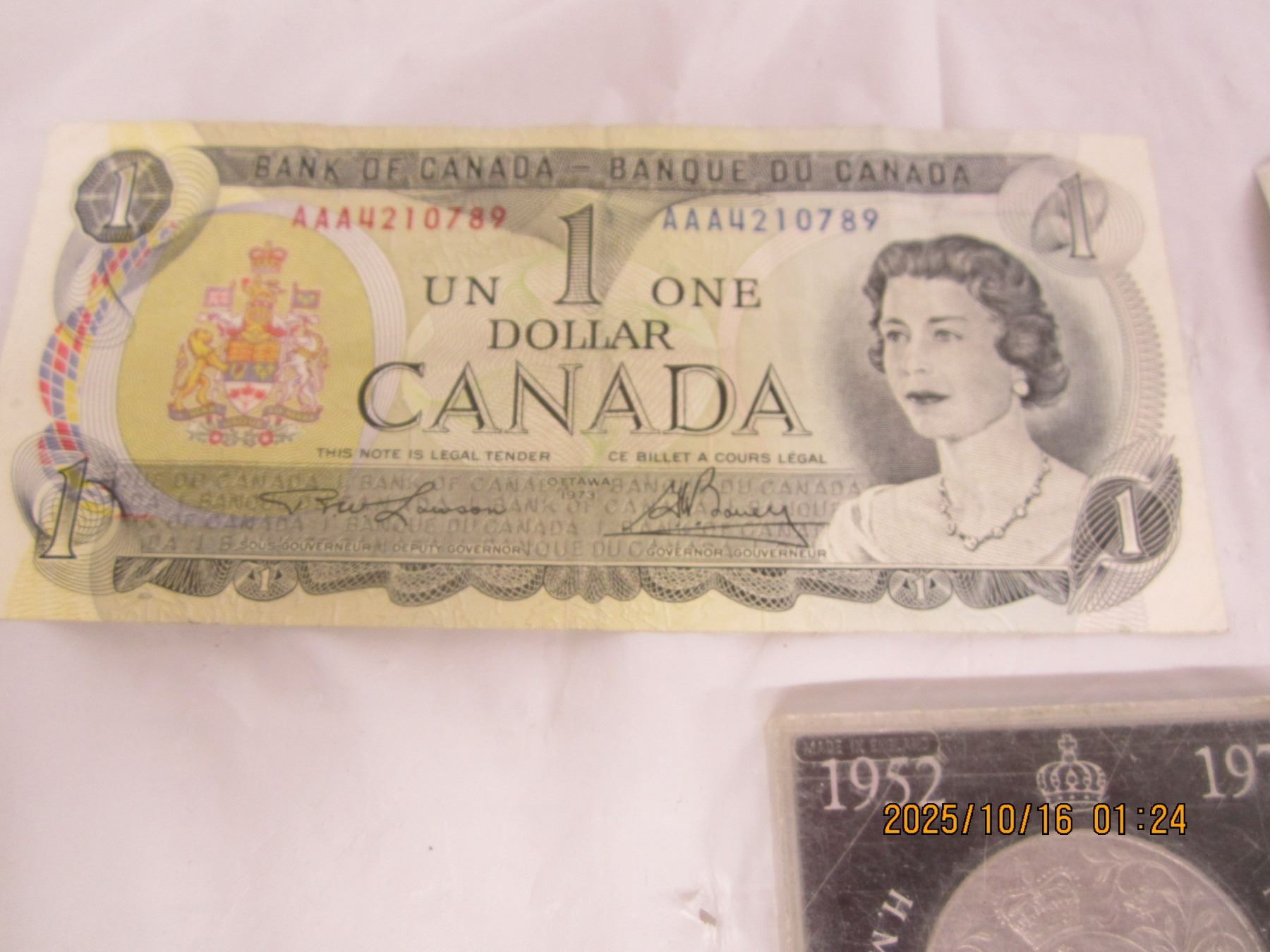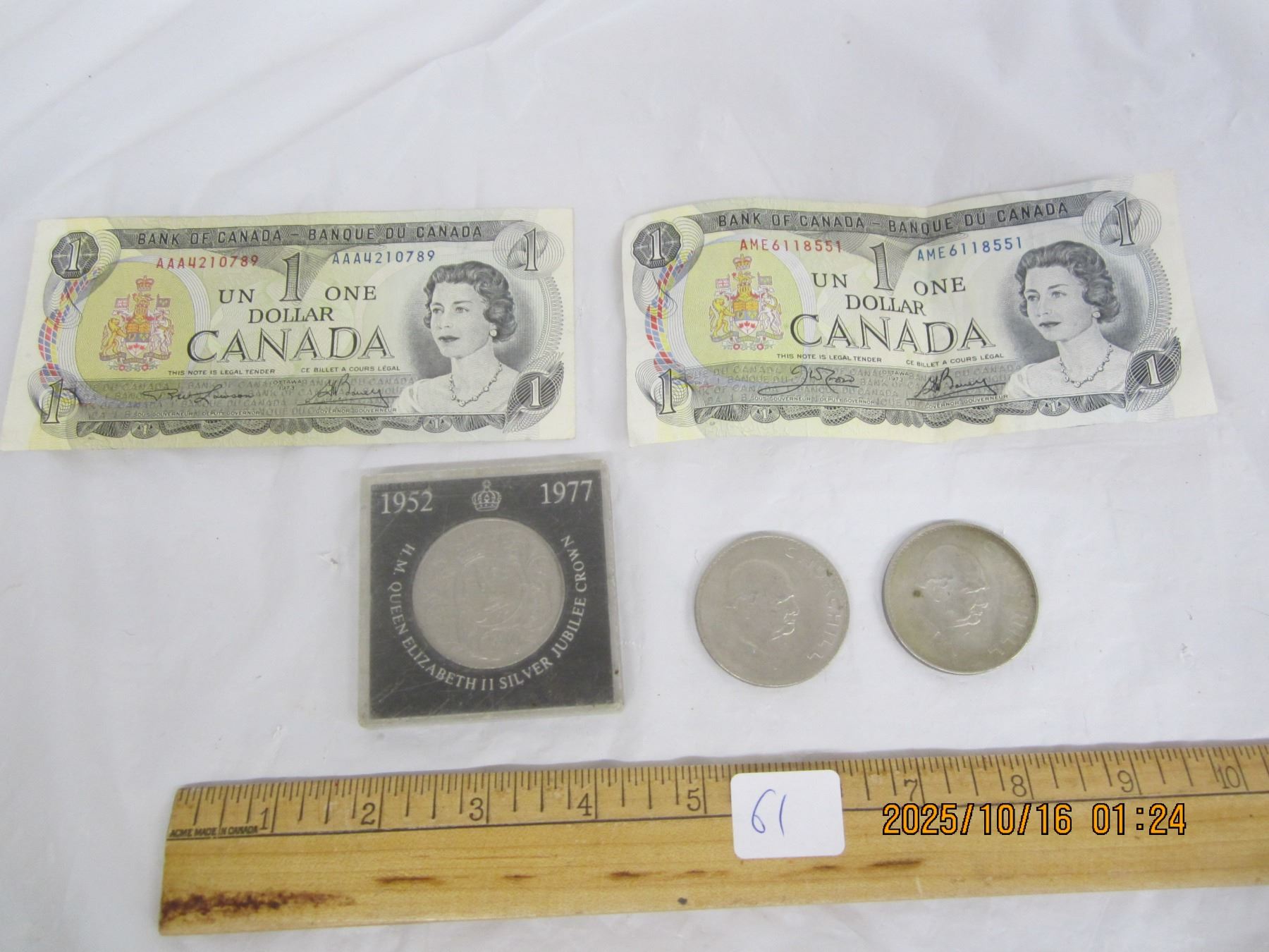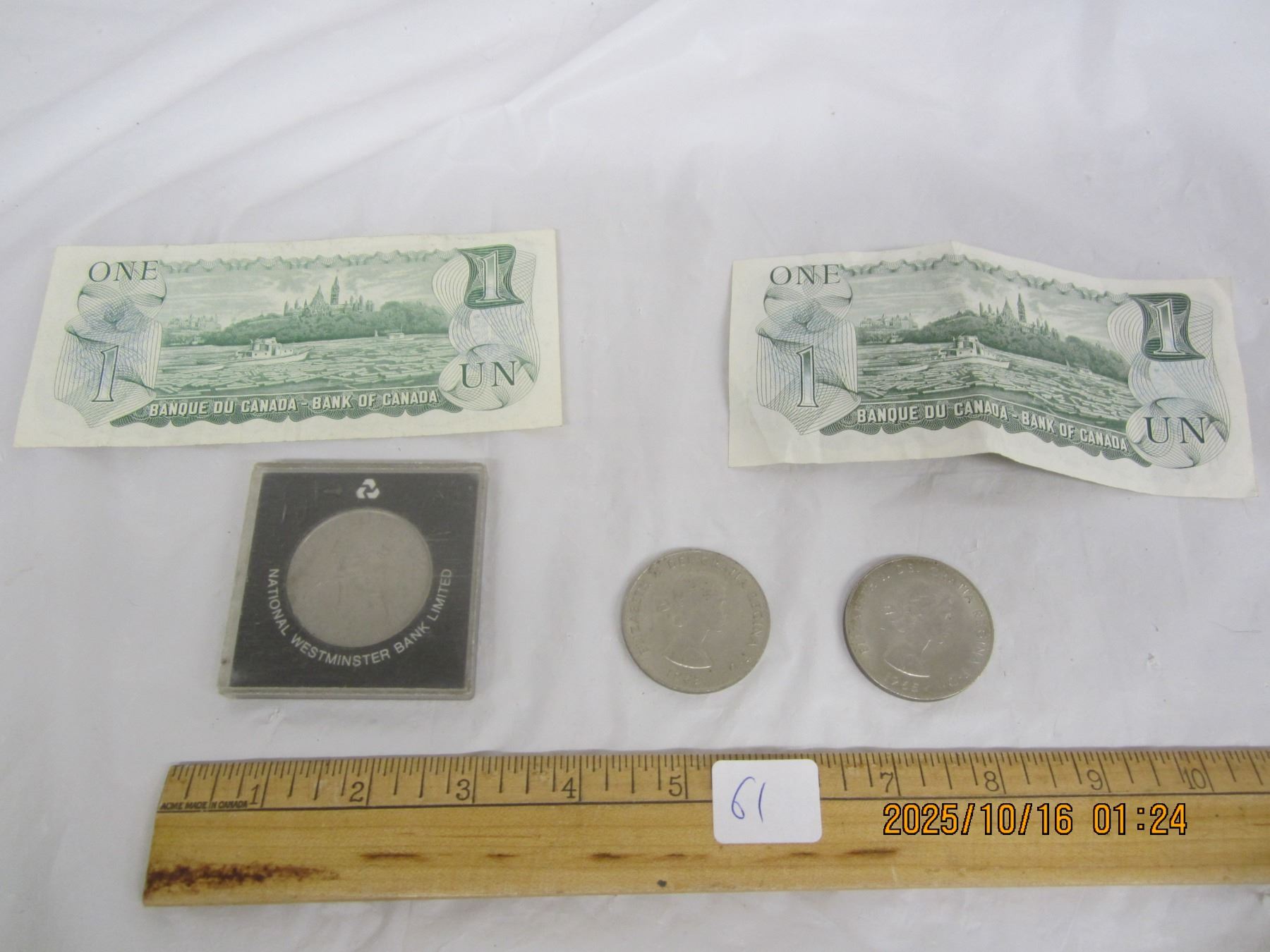 Lot of 3 Vintage Tokens and 2 Canadian One Dollar Bills