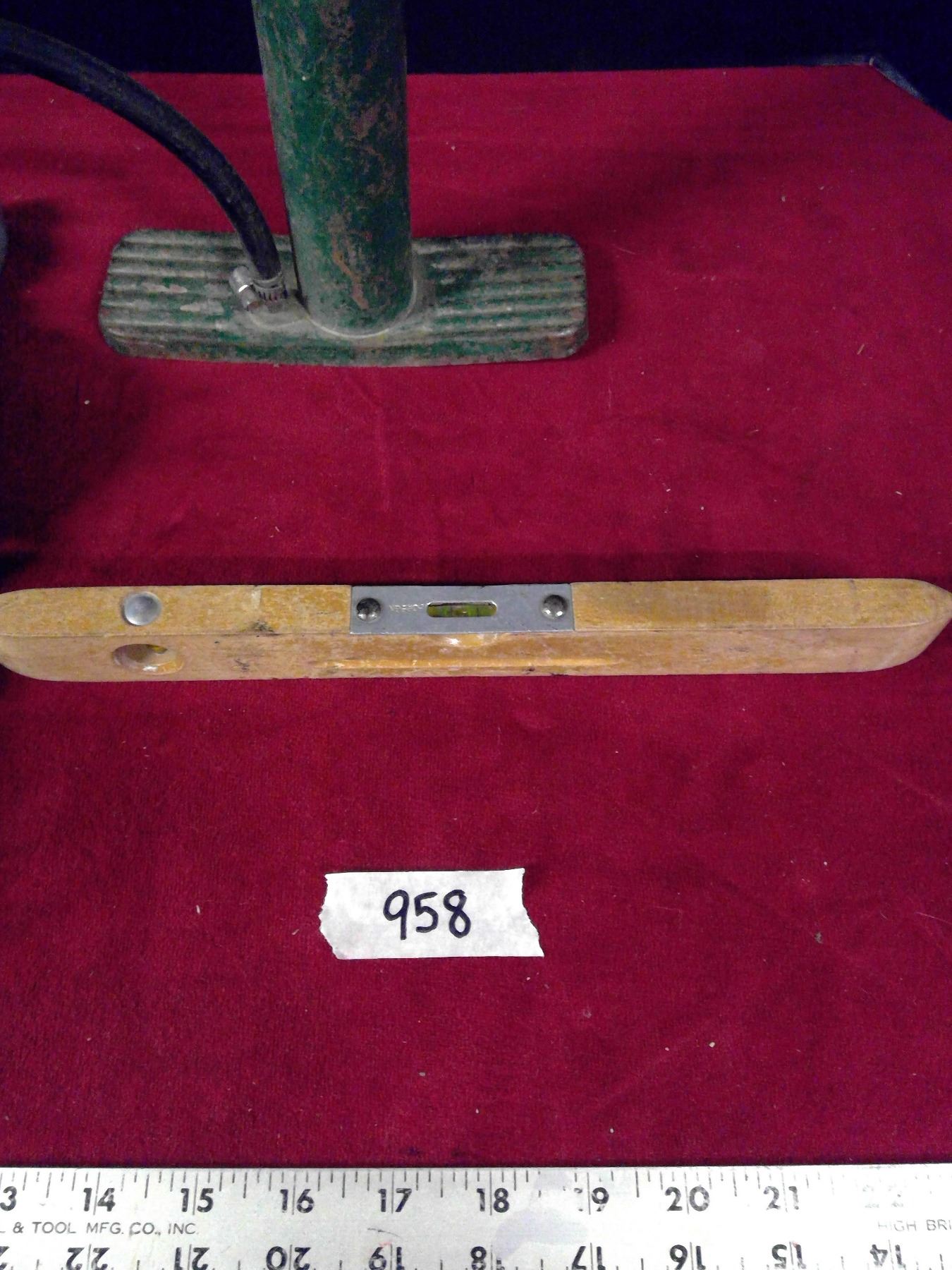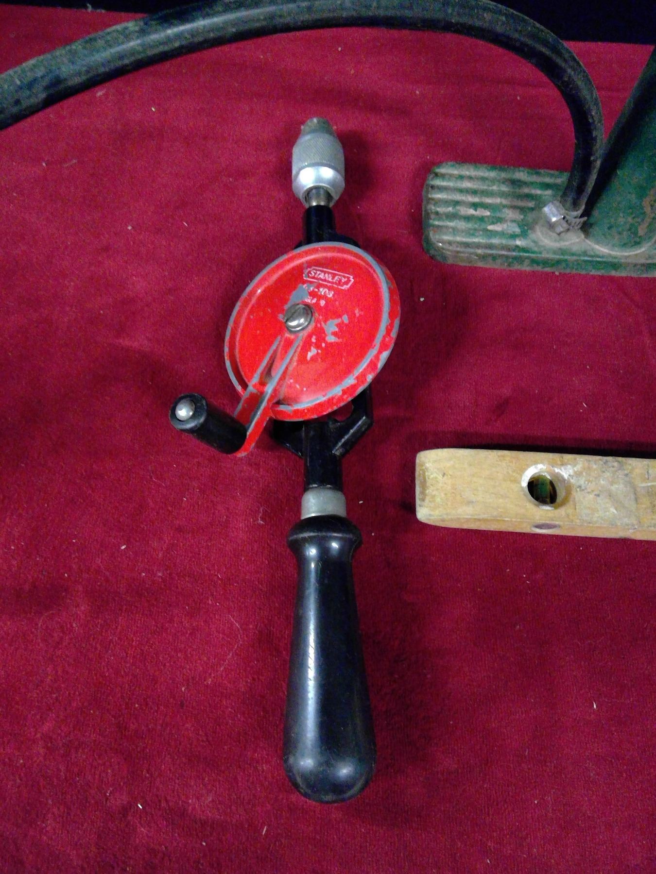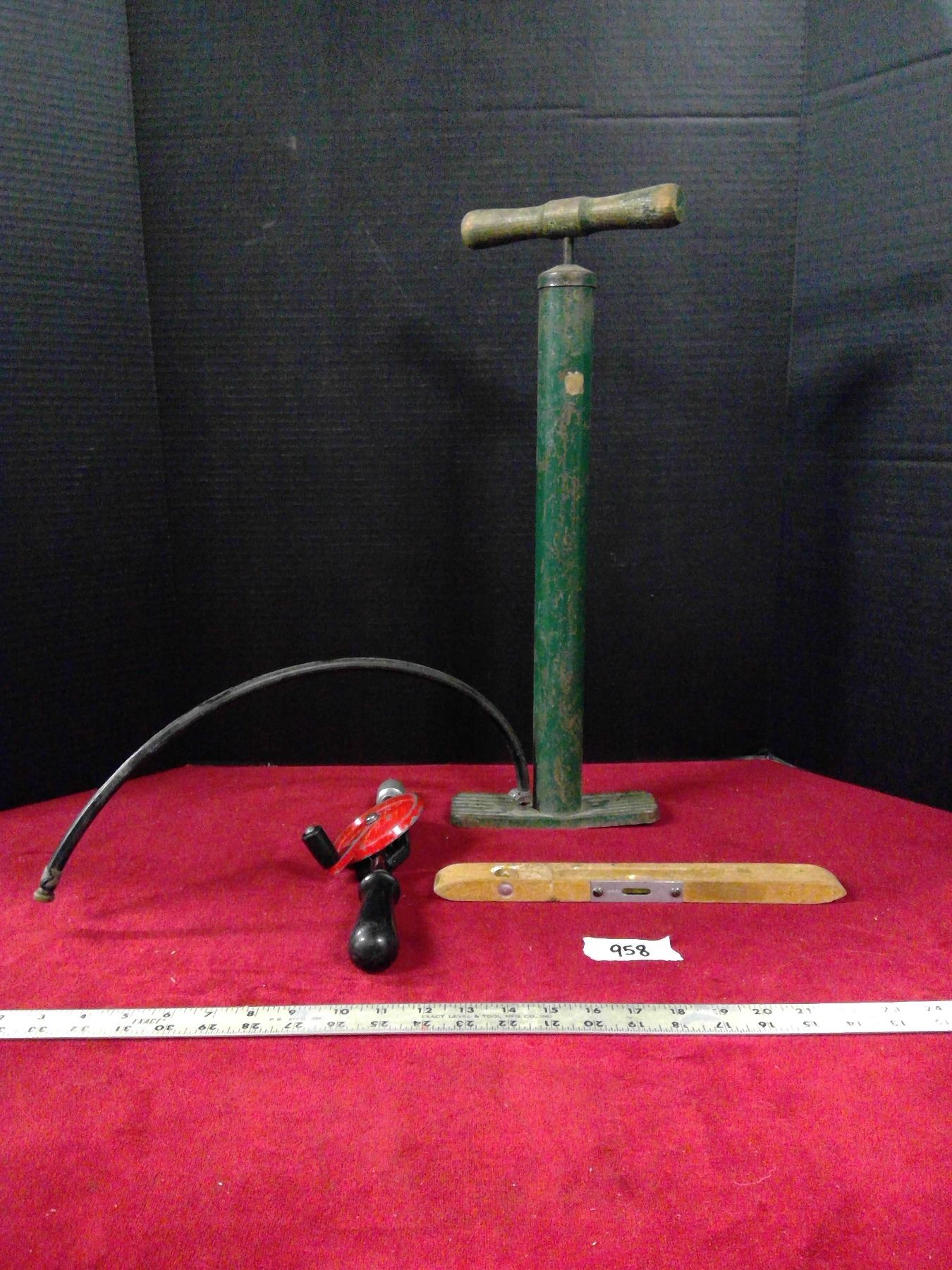 Vintage Stanley Hand Drill, Wooden Leveler and Air Pump