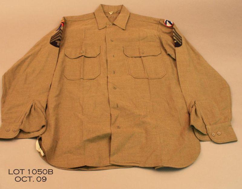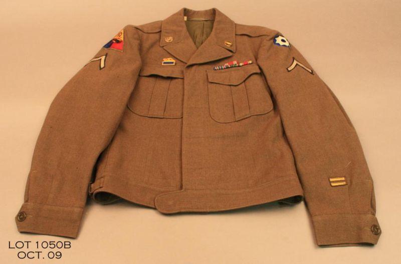 Lot of 3 WWII US Military tunics 1 ea. 10th armor Ike jacket, 1 ea. US Navy seabees jacket, 1 ea. 71st infantry shirt. Est. $100 - $200