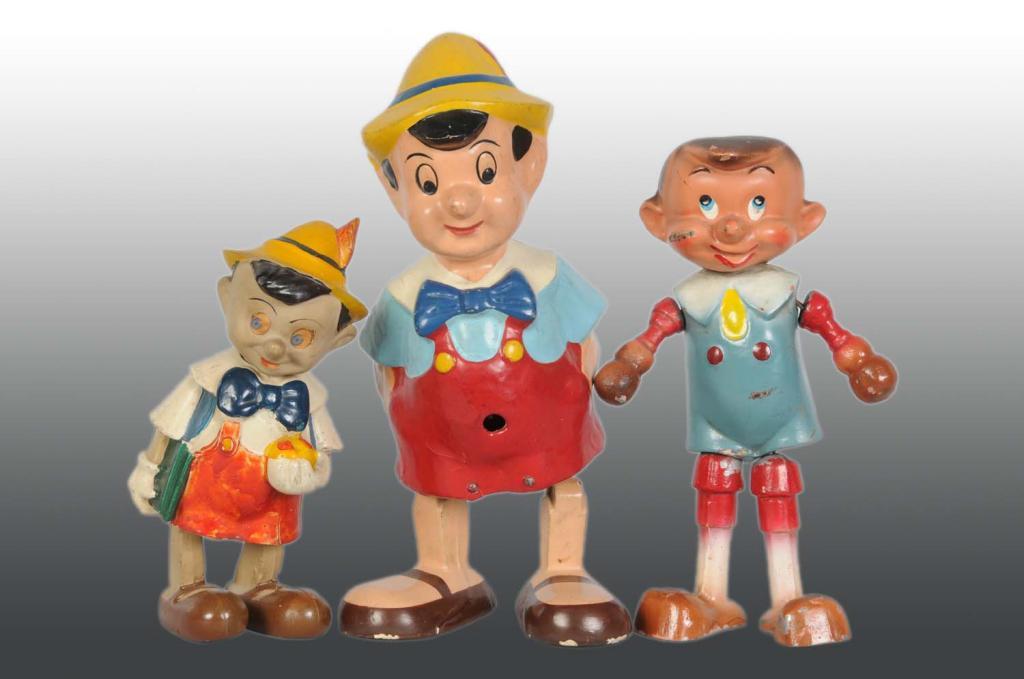 Composition and metal. Includes two working French wind-ups with some moderate overall chipping and wear. Larger wind-up has crazing on hind end and chipping to feet. Lot also includes a metal doll with jointed head, arms and legs. Metal doll is unmarked but is probably European. Doll is missing hat and has moderate overall chipping and wear. Condition (Very Good). Size Largest: 10" T.