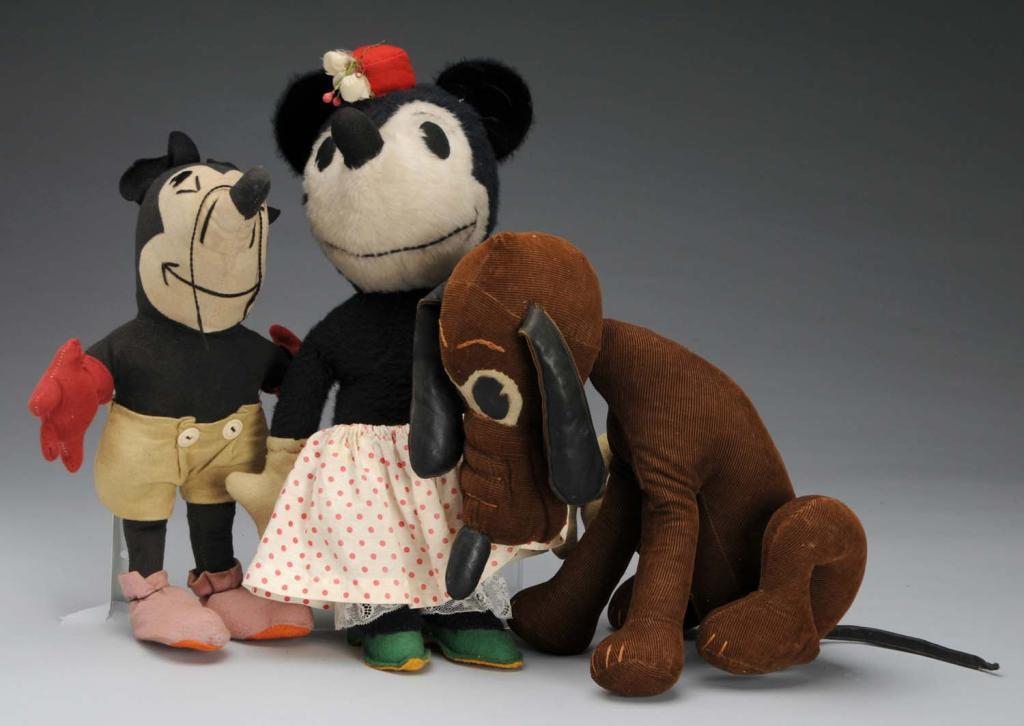 Includes Pluto, Mickey and Minnie Mouse dolls. Pluto's body is corduroy with nose, ears and tail made of leather. Unmarked but probably English or American made. Mickey and Minnie both have felt clothing with missing whiskers and tail on Mickey. Minnie has a hat with feathers and does include tail. Some soiling to Mickey's face. Condition (Very Good - Excellent). Size Largest: 17" T.