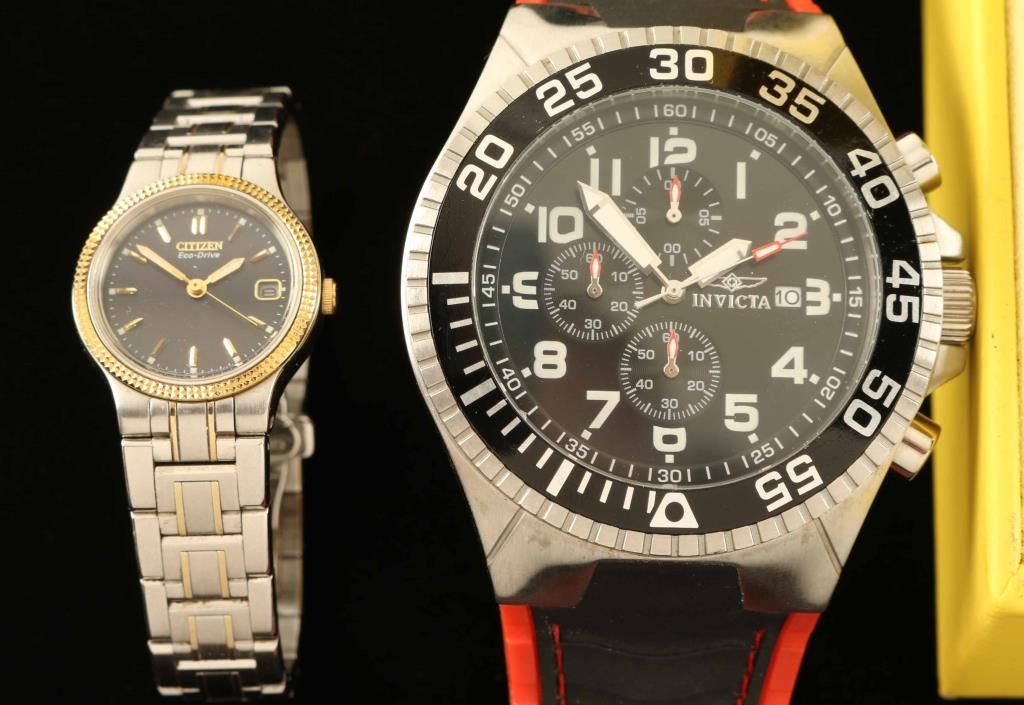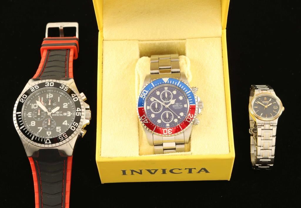 Includes (2) Invicta Watches both in working condition. Also includes (1) Citizen Eco-Drive watch in working condition.