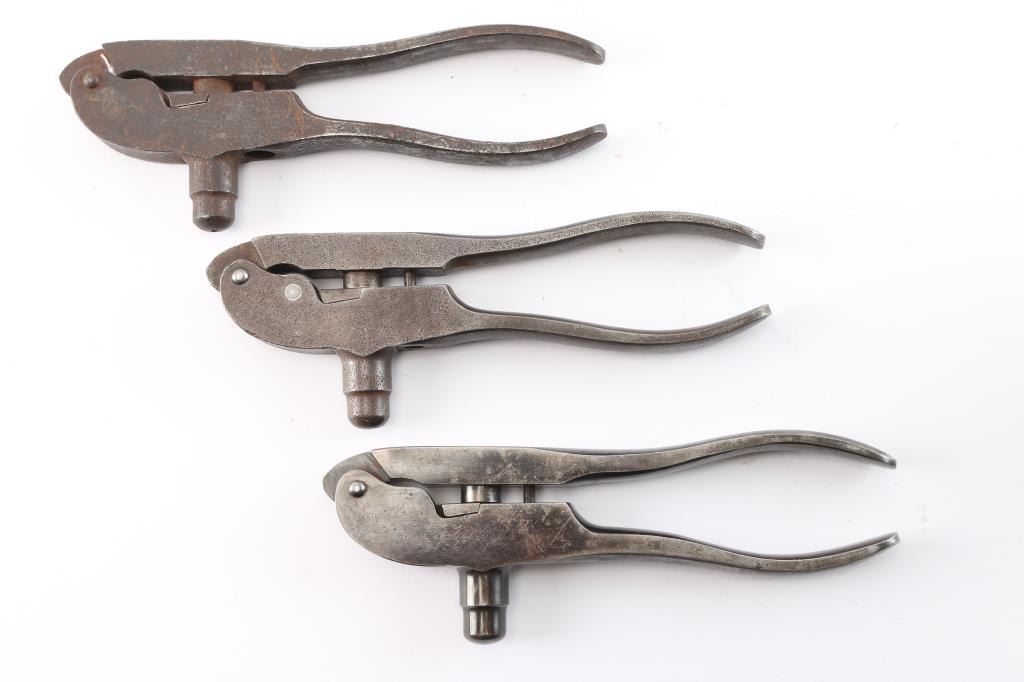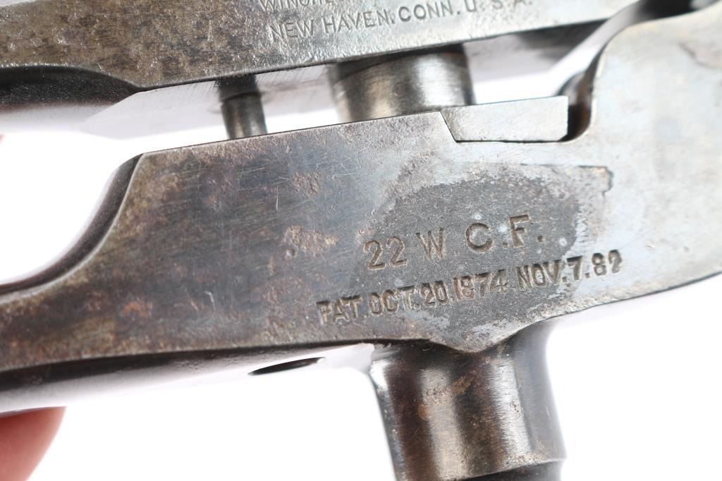 A. Model 1882 in 32 W.C.F. (32-20) showing 50% fairly bright blue with normal marks and aging. A 7 1/2" to 8" on 1-10 grading scale. B. Model 1882 in 22 WCF showing patina with light to moderate pitting. A 5-6 on 1-10 scale. C. Model 1874/82 loading tool showing dark patina, moderate overall pitting, fair markings. A 5 on 1-10 scale.