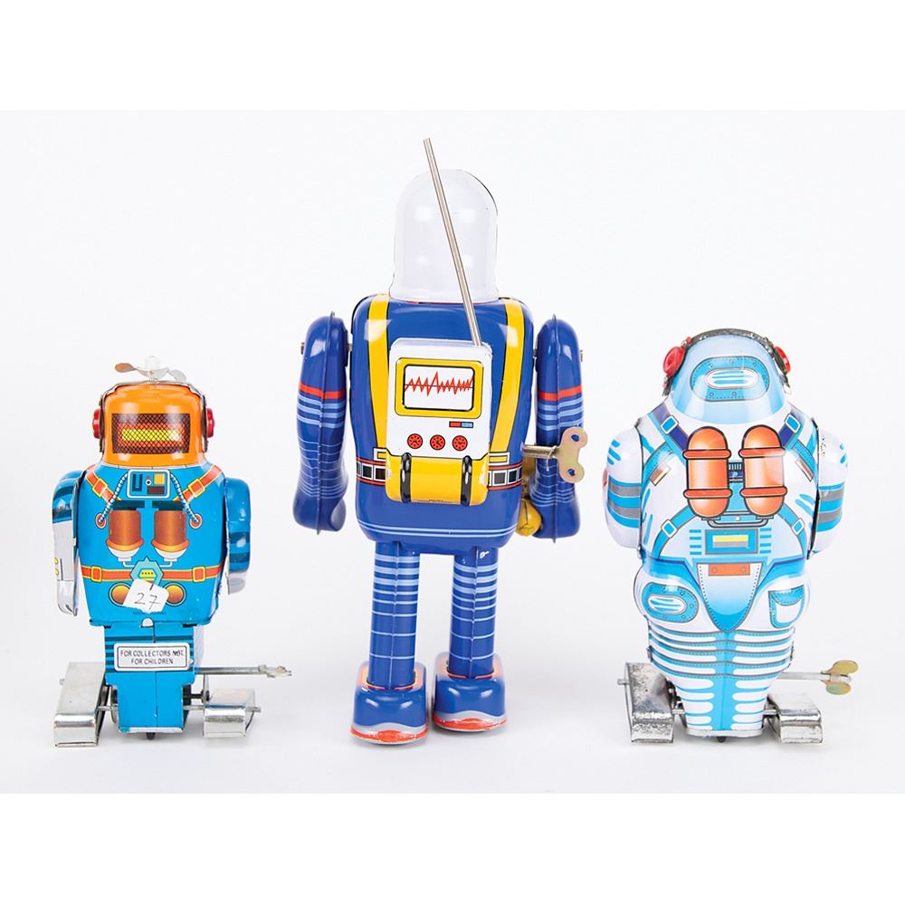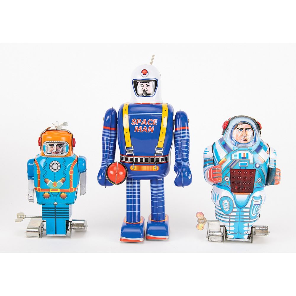 Three circa 1990s–2000s wind-up tin litho astronaut robot collectible toys, all made in China. Includes: a 6˝ tall blue-and-orange "Astronaut Robot" (JMT54); a 6.5˝ tall blue-and-white sparking "Astronaut Robot" with spark feature (JMT53); and a 9˝ tall blue-and-yellow "Space Man" walking robot. All three include their original boxes.