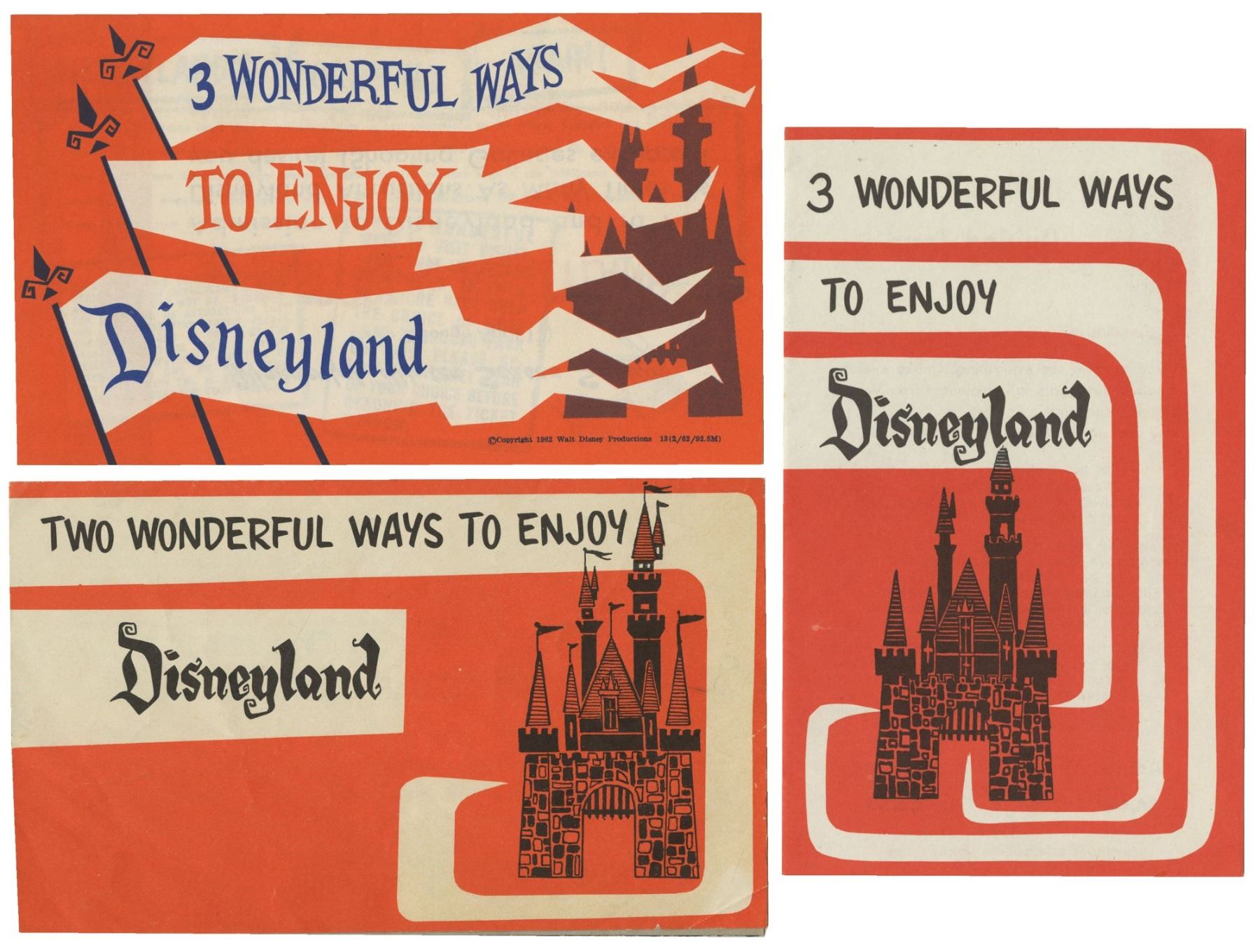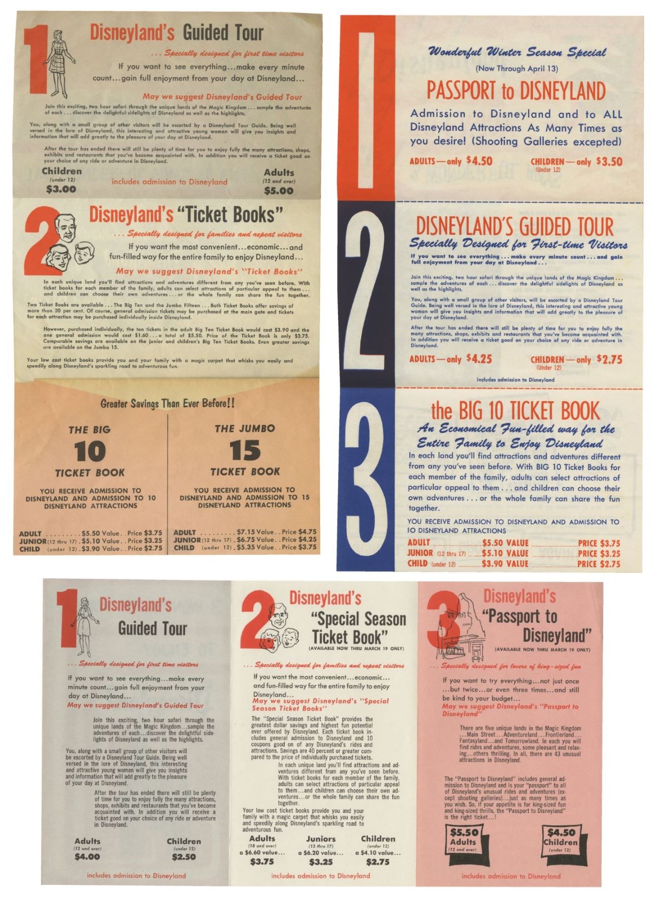 (Disneyland, 1961-62) A group of (3) scarce gate flyers from Disneyland. The set provides information about special offers at the park such as Disneyland passports, guided tours, and ticket book specials. Measuring 5.75"x3.5" each when folded, the flyers are in very good condition with minor creasing from use.