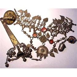 Lot of 3 adornments. First a V-shaped clasped piece of interlocked rings with embossed plaques, carnelian stones, red and turquoise glass beads, and tear-drop pendants. Probably part of a head-dress. Secondly a metal spindle whorl with embossed gilded decorating and a looped shaft with similar embossments and three looped chains of bells. Lastly a ring with a large embossed bezel and blue glass stone attached to a chain with a thimble set with a red glass stone at its' head. An interesting lot of three items. $100 - $150